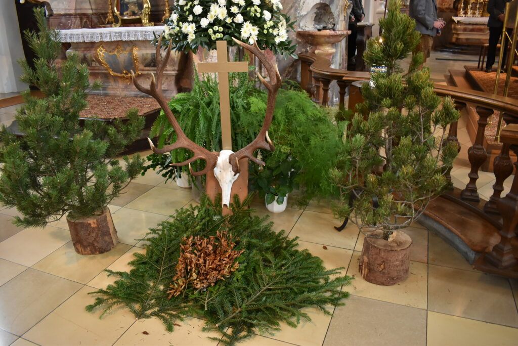 Pater Hubert Veeser zelebrierte die Heilige Messe und erzählte zu Beginn die Legende des Heiligen Hubertus, der erst gar kein guter Mensch war und keine Regeln kannte. Als er an einem Karfreitag zum Jagen ging, begegnete er Jesus Christus in Form eines leuchtenden Kreuzes zwischen dem Geweih eines Hirsches, den er schießen wollte. Er änderte sein Leben radikal und wurde später Bischof von Lüttich/Niederlande.