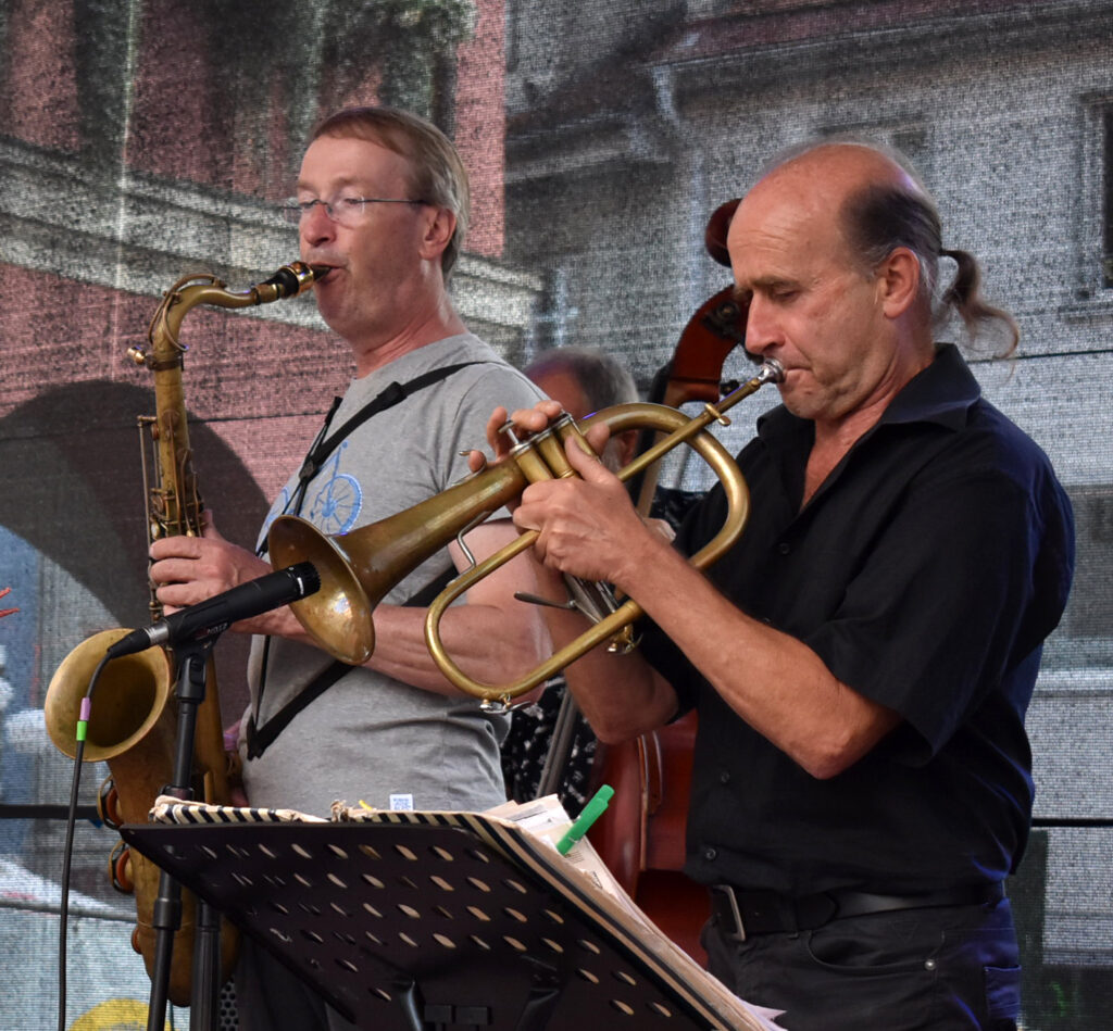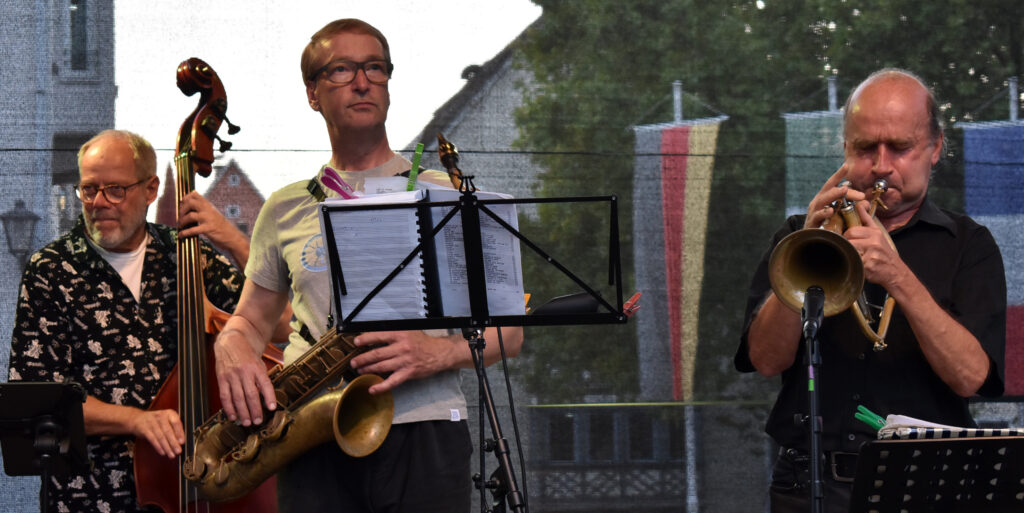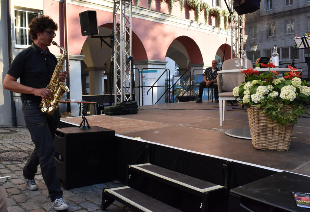 19.00 Uhr: Klänge hoch über dem Gänsbühl, außergewöhnliche Töne, mal harmonisch, mal abgehackt, mit Effekten, ähnlich einem Schnaufen oder Schleifen. Christian Segmehl kommt (Bild) mit einem Alt-Saxophon von der Schneegasse am Publikum vorbei herunter auf die Bühne und gibt hier noch eine besondere Kostprobe seiner Kunst. Es ist Improvisation pur, so kennt man ihn. Er ist ein Meister seines Fachs. Er müsse schon auch üben, das sei harte Arbeit.