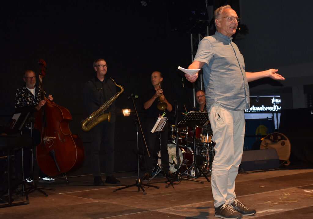 Moderator Joachim Rogosch begrüßte die zahlreichen Gäste, den neuen Leiter der vhs, Stephan Wandinger, die vielen Sponsoren und Unterstützer des Talks, und natürlich das Jazz-Ensemble Just Friends, seit Talk-Beginn im Jahr 2001 mit dabei. Sie eröffnen musikalisch, füllen die Pausen zwischen den Talk-Gästen, spielen groovigen Jazz. Rogosch wies gleich zu Beginn (wie immer) auf den Spenden-Charakter des Talks hin. Es geht diesmal um einen Multifunktionsraum für den Kindergarten in Reichenhofen. Einen Container dafür spendet die Firma Milei, dieser muss fest verankert werden und für diese Bodenplatte galt es zu spenden. Am Ende waren es gut 1700 Euro, Spenden für diesen Zweck sind auch im Nachhinein noch möglich.