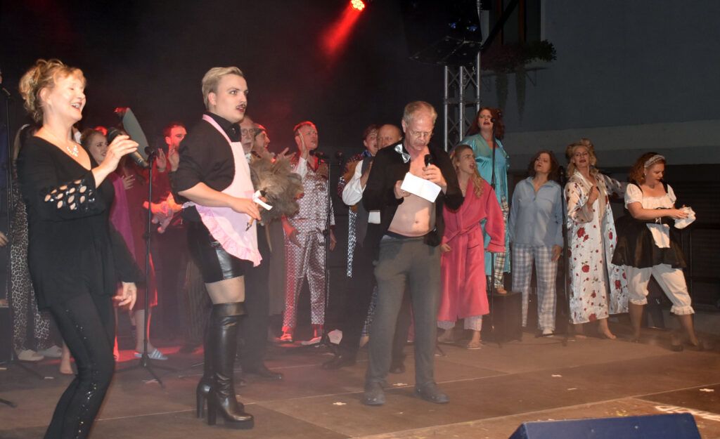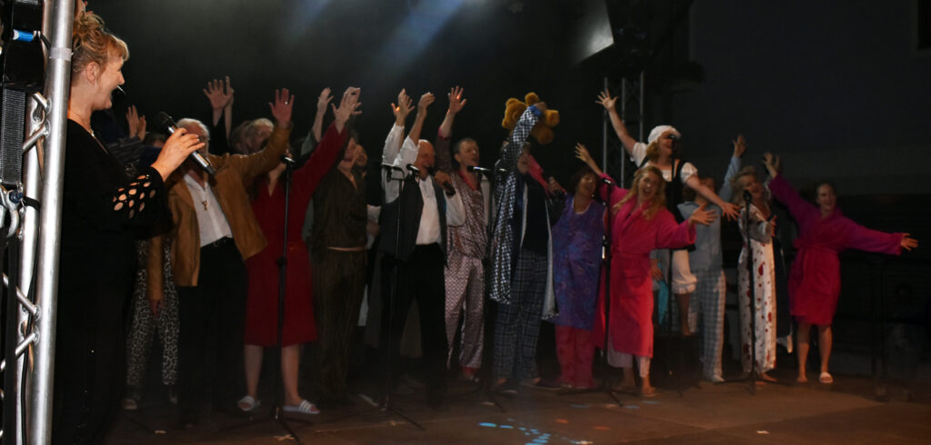 Im Stil von Udo Jürgens: Angelika Maiers Truppe in Bademänteln bei der Zugabe.
