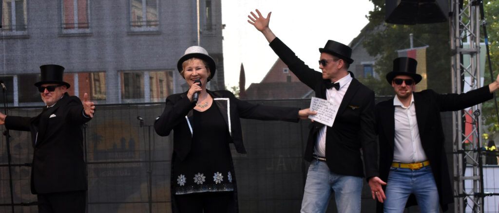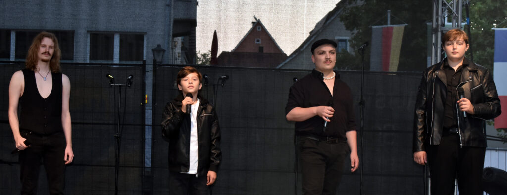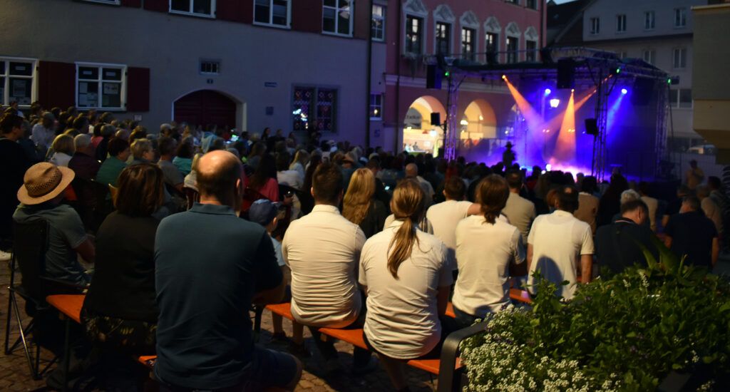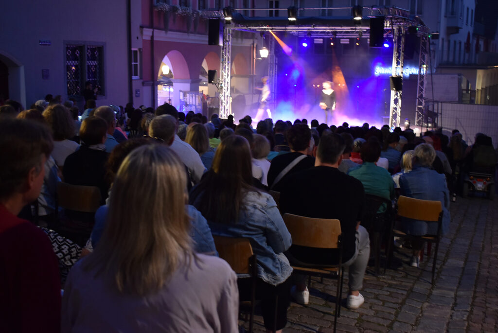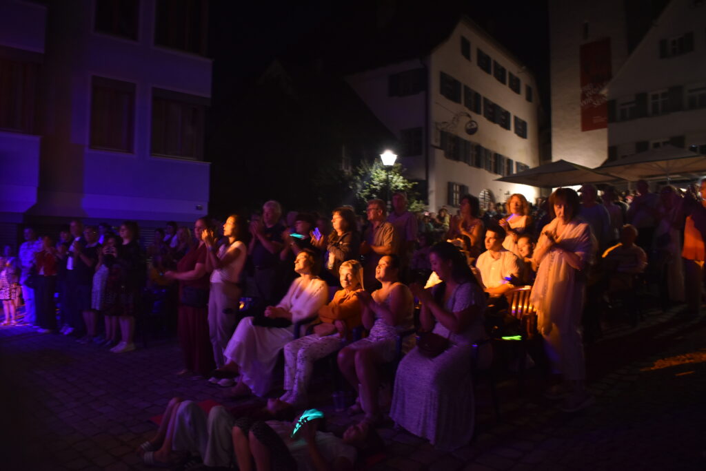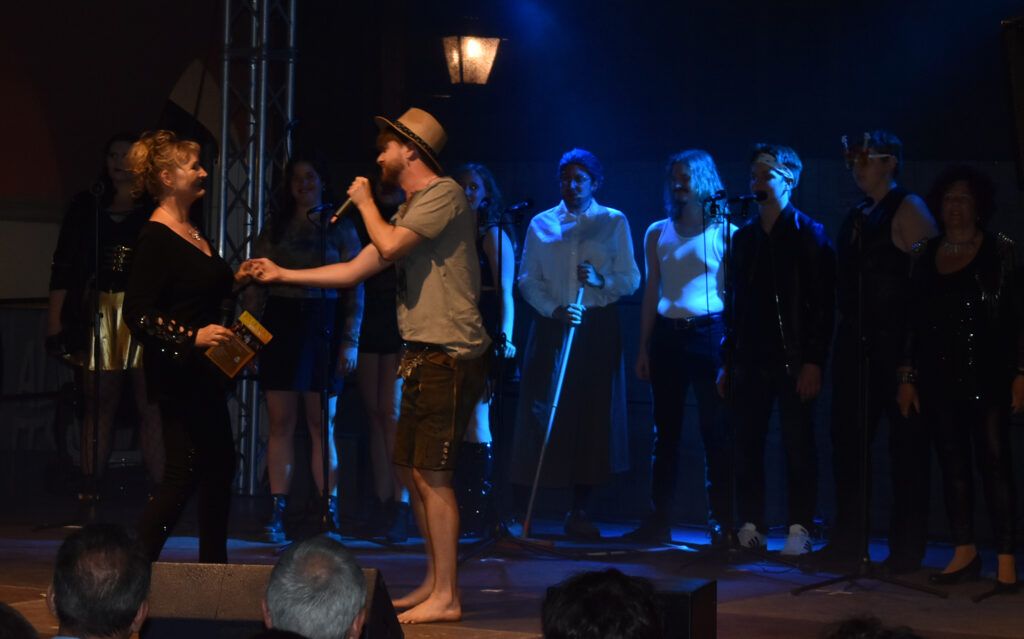 Dann kam er – wie ein Geist hereingeschneit – Kevin Prinz aus Leutkirch, der Lokalmatador, für den es keine Ansage braucht. Die Stimme allein, seine Bewegungen reichen aus, um ihn, auch mit Hut und in Lederhose, bei Nacht und Dunkel zu erkennen. Mit seinem Lied „Schenk mir noch eine Stunde“ von Udo Jürgens eroberte er sicher viele Herzen und man hätte noch mehr hören wollen, die Stunde vollenden. Doch Kevin war in der Show nicht eingeplant, kurzfristig war er doch in Leutkirch, trat nach der Pause auf und verschwand wieder im Dunkel der Altstadt.