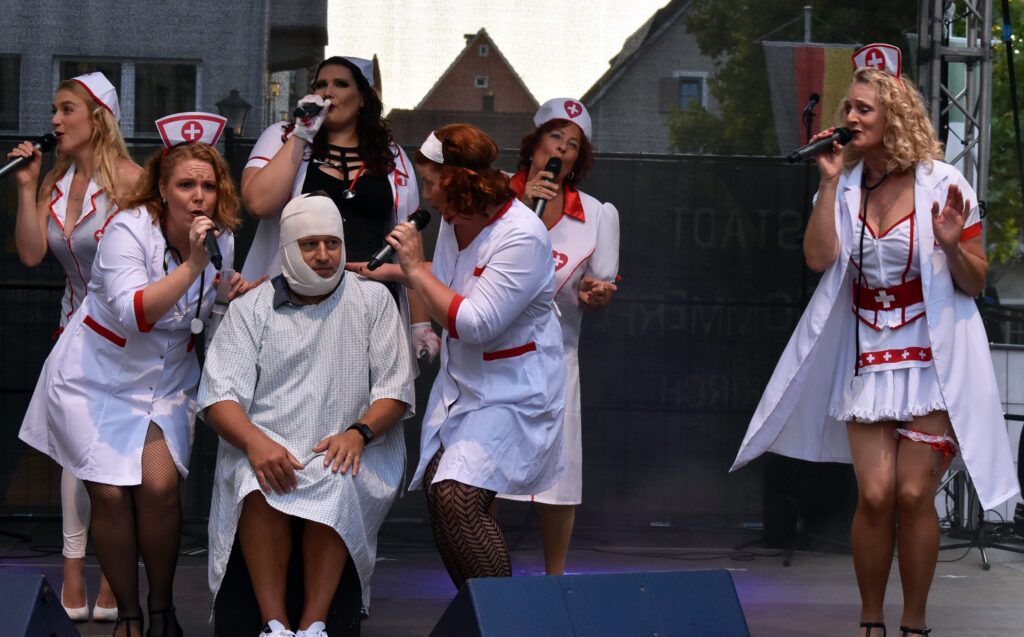 Dann ging es „wie im Flug“ auf eine musikalische Weltreise, mit einem erfahrenen singenden Piloten und seiner hübschen Stewardessen-Crew in Uniform, mit vielen Stationen wie Schlösser (König Ludwig – Schattenmann), Wien (Elisabeth – Sisi), USA (Sklavenlieder und „Grease“), nach England (Queen-Medley mit Freddy-Mercury-Stimme) oder zu den Hexen von Oz und natürlich auch nach Deutschland (Udo-Jürgens-Potpourri („Aber bitte mit Saaahne!“); auch ein Lied von Roger Cicero wurde dargeboten.