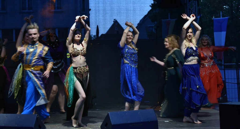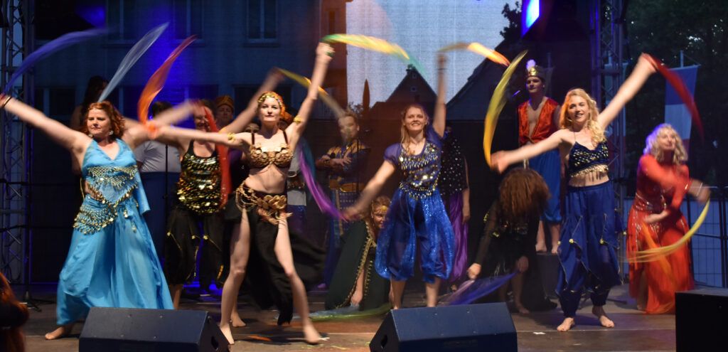 „Wir haben gleich vier Elisabeths für Leutkirch mitgebracht“, ließ Angelika Maier stolz verlauten. Vier Damen, jede in einem noch schöneren langen weißen Kleid, sangen vom Schicksal der traurigen Kaiserin Sisi in Wien. „Wir haben vier Witches von Oz“, hieß es weiter und auch diese Songs waren dem Publikum wohl bekannt. Alladin – darf nie fehlen mit dem Hingucker, einem lebensecht wirkenden Kamel, kommt durchs Publikum dahergewackelt, steigt auf die Bühne. Wunderschön geschminkte Bauchtänzerinnen zeigen ihr Können, schwingen bunte Tücher, singen zu orientalischen Klängen.