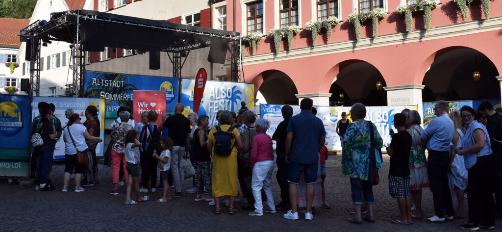Leutkirch – Der Sonntagabend (10.8.) beim ALSO war perfekt: 22 Grad, blauer Himmel, die Schlange der Leute mit Tickets für den Abend mit einem der wohl renommiertesten Show-Ensembles in der Region Allgäu-Oberschwaben war fast 100 Meter lang. So voll sieht man den Gänsbühl in Leutkirch eben nur zum ALSO-Festival, alle Sitz- und Stehmöglichkeiten waren belegt. In den vorderen Reihen die VIPs, die Premium-Sponsoren; viele Angehörige und Freunde der Showkünstler, Musical-Fans und Festspielhaus-Füssen-Liebhaber, Interessierte, Touristen, Leutkircher, alle waren gekommen, um das große und groß angekündigte Event mitzuerleben: JOY OF VOICE goes L.A. – was so viel heißt wie: Die Freu(n)de zu singen kommt nach Leutkirch im Allgäu!