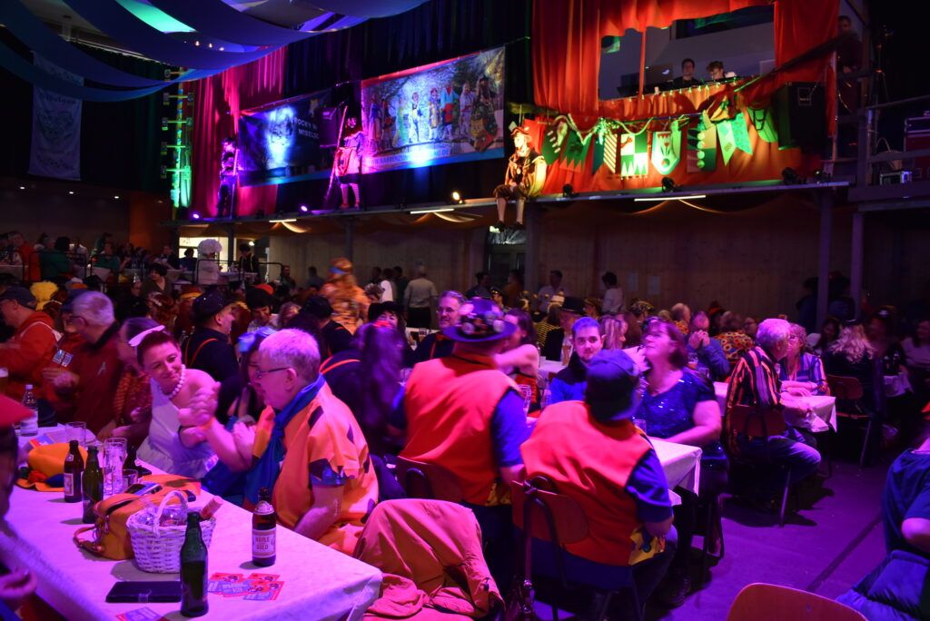 Auch die Narrenzunft-Oldies bestreiten jedes Jahr einen Programmpunkt, was sehr gut ankommt, immerhin sind die meisten 50 plus. Als Schlümpfe verkleidet, mit Papa Schlumpf, unterhielten sie das Publikum mit einem Nibelgaulied. Auch Freddy und Franzi luden immer wieder zum Mitsingen ein, Bella Napoli schallte durch die Halle, es wurde geschunkelt und zwischendurch gab es zur Auflockerung eine Tanzrunde.