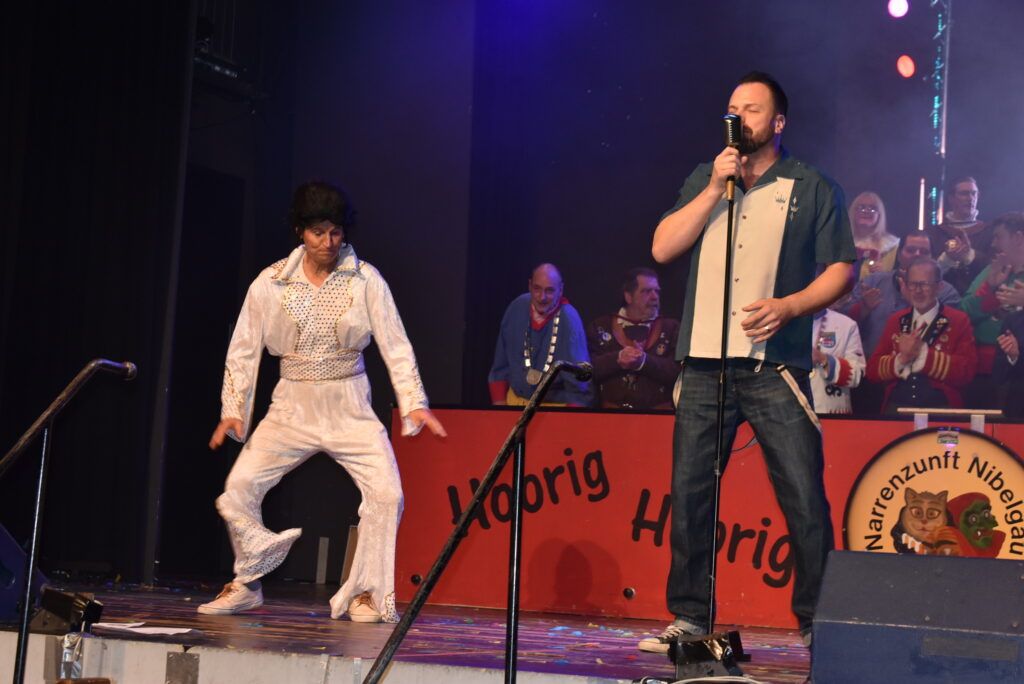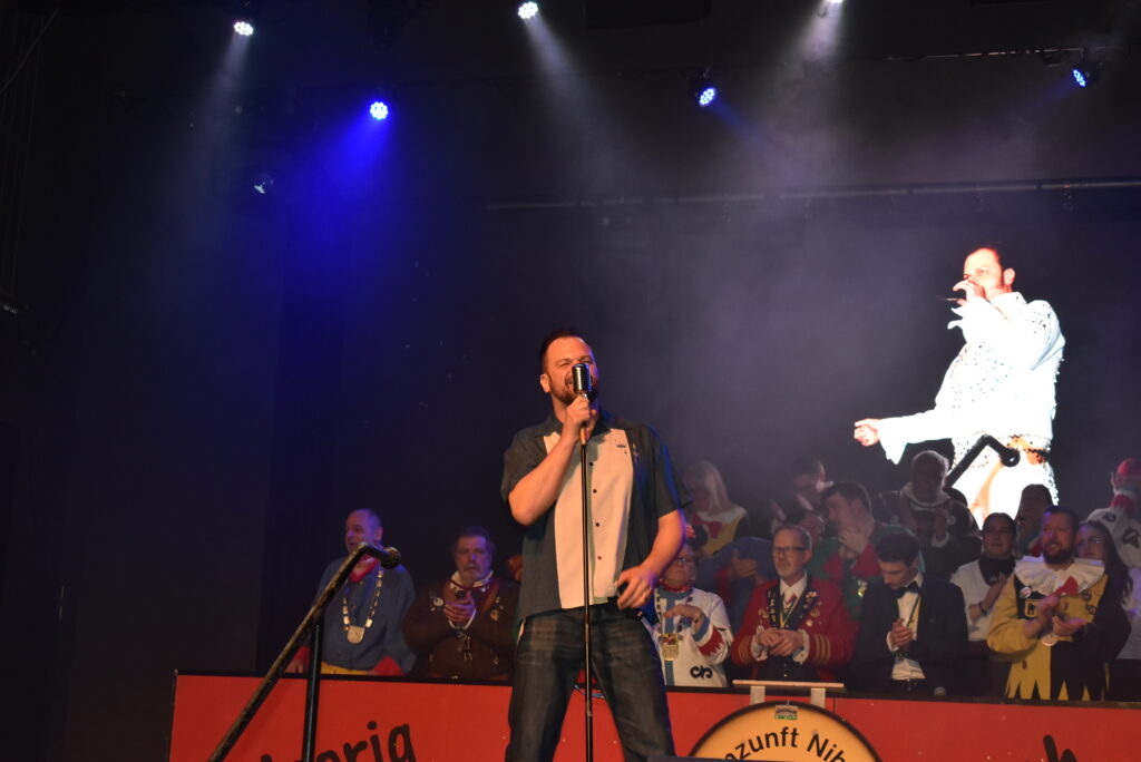 Ein besonderes Jubiläum konnte der Leutkircher Elvis-Sänger Oliver Peidl feiern. Vor genau 30 Jahren trat er als 18-jähriger „Bua“ auf und mimte erstmals den berühmten Elvis im typischen weißen Nietenanzug, sang mit dieser unverwechselbaren Stimme weltbekannte Elvis-Lieder und schwang die Hüften. Er durfte am Samstagabend (14.2.) nicht fehlen, begeisterte so sehr (auch ohne Elvis-Outfit), dass mehrere Zugaben fällig waren. Passend zum Valentinstag agb es auch Liebeslieder. Im Hintergrund waren über Beamer Fotos von früher eingeblendet, ein Elvis-Tänzer aus dem Publikum kam spontan auf die Bühne, beide rockten zusammen den Saal.