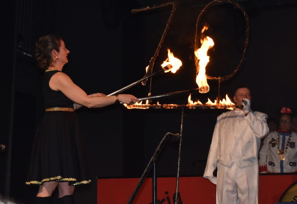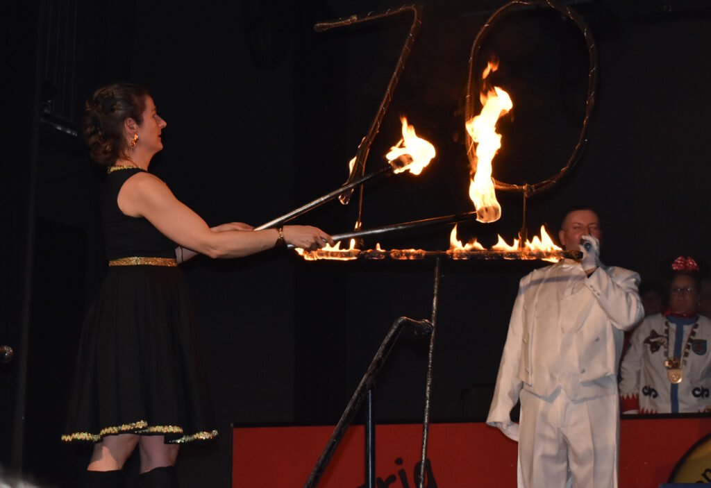 Der letzte Höhepunkt beim Bürgerball war die Feuershow der Wangener Künstlerin Mancucela. Sie zeigte eine wunderbar-feurige Performance, schwang in atemberaubender Geschwindigkeit die Feuerschalen und –fackeln zu monumentaler Musik. Am Schluss wurde die Zahl 70 entzündet, passend zum Jubiläum der Narrenzunft.