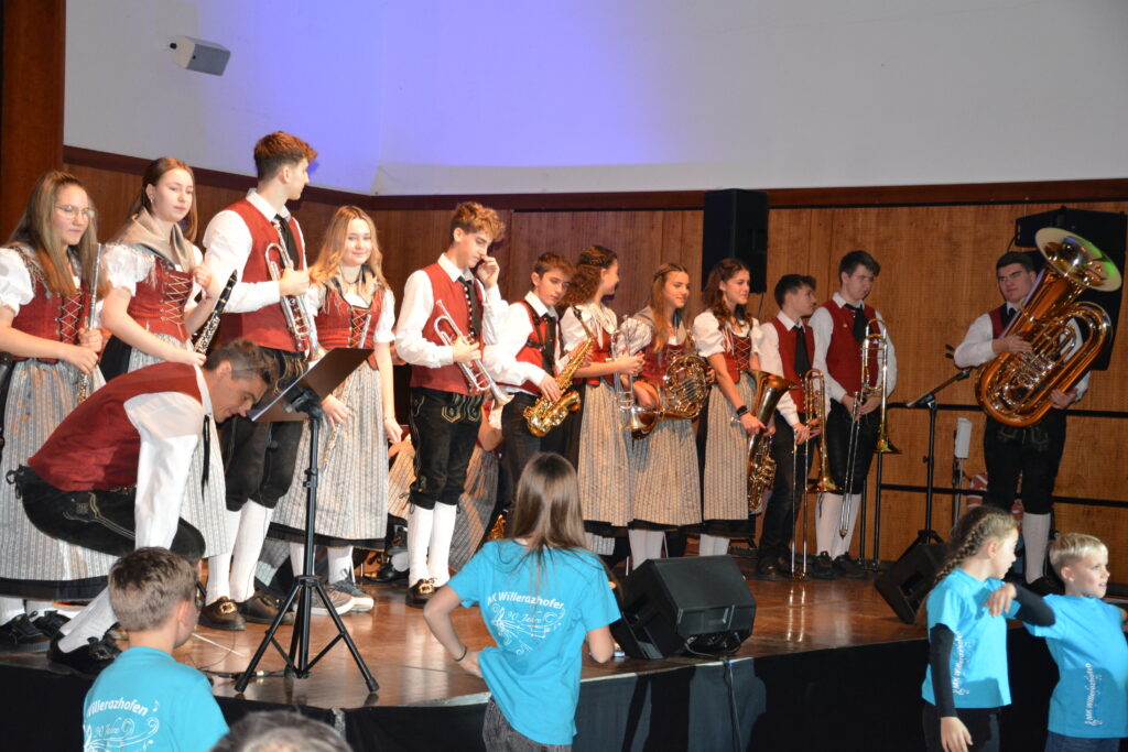 Einen großen Auftritt hatten die jungen Nachwuchs-Künstler gleich mehrmals beim musikalischen Höhepunkt der Jubiläumsfeierlichkeiten, ein fulminantes Show-Konzert in der Leutkircher Festhalle Anfang des Jahres 2024. Mit einem Soli-Auftritt auf dieser ganz besonderen Bühne konnten sie in der zwei Mal ausverkauften Festhalle mit schon recht professionellem Spiel begeistern. Die Jüngsten der Jungmusikanten-Truppe waren ebenfalls voller Leidenschaft und hatten viel Spaß dabei, immer wieder neu verkleidet, passend zu Musikstücken durchs Publikum zu tanzen oder sich in Kostümen zu präsentieren.