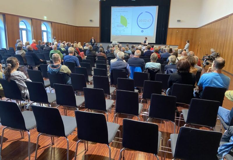 Der Saal war bei weitem nicht voll, als Amtsinhaber Hans-Jörg Henle und sein Herausforderer Franz Josef Natterer-Babych sich vorstellten und Grundzüge ihrer kommunalpolitischen Ziele erläuterten sowie Fragen aus der Bürgerschaft beantworteten.