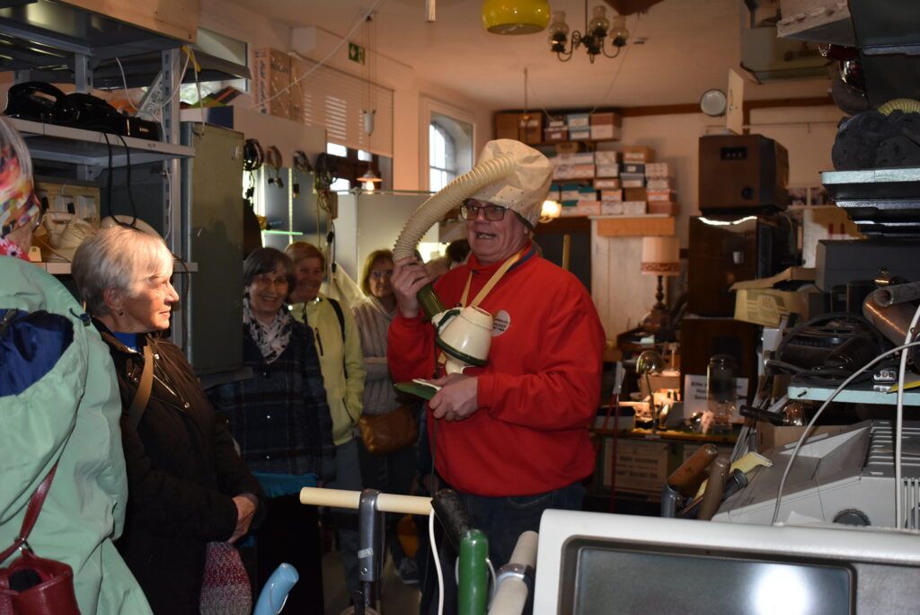„Früher kaufte man vieles auf Raten, immerhin kostete eine moderne Waschmaschine in den 60-er Jahren 1800 D-Mark“, betonte Stör. Er zeigte Föhngeräte sowie die ersten Bügeleisen von 1905, als das Bügeln noch Plätten hieß und recht schlagkräftig ausgeführt wurde. „Es gab Bügeleisen für Rechts- und Linkshänder, aus Porzellan und sogar Reisebügeleisen, mit denen man auch Teewasser kochen konnte“, erzählt der Museumsführer mit Begeisterung. Über Damen-Rasierer kam er zu den Staubsaugern und diversen Multifunktionsgeräten, dass die Frauengruppe nur so staunen konnte.