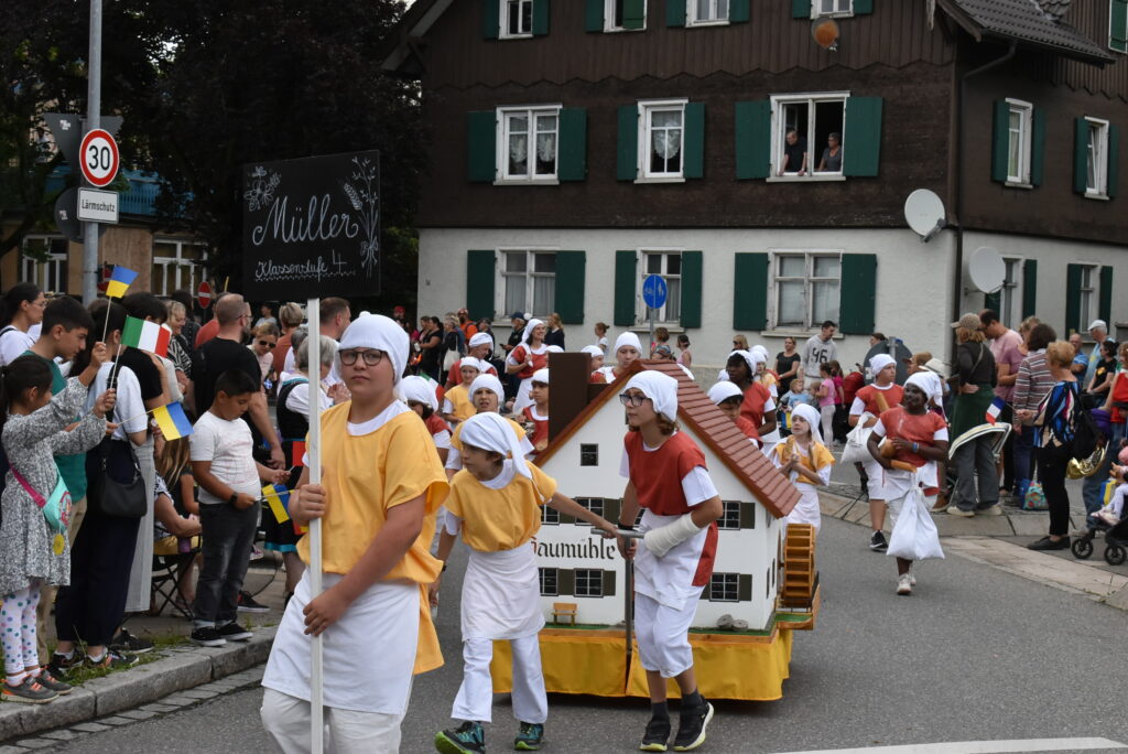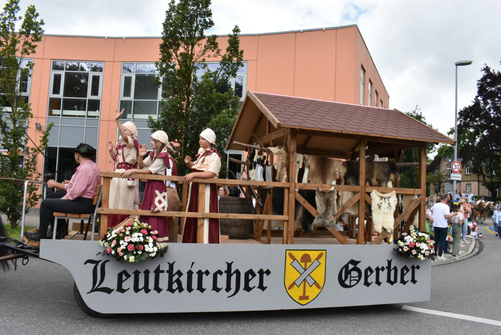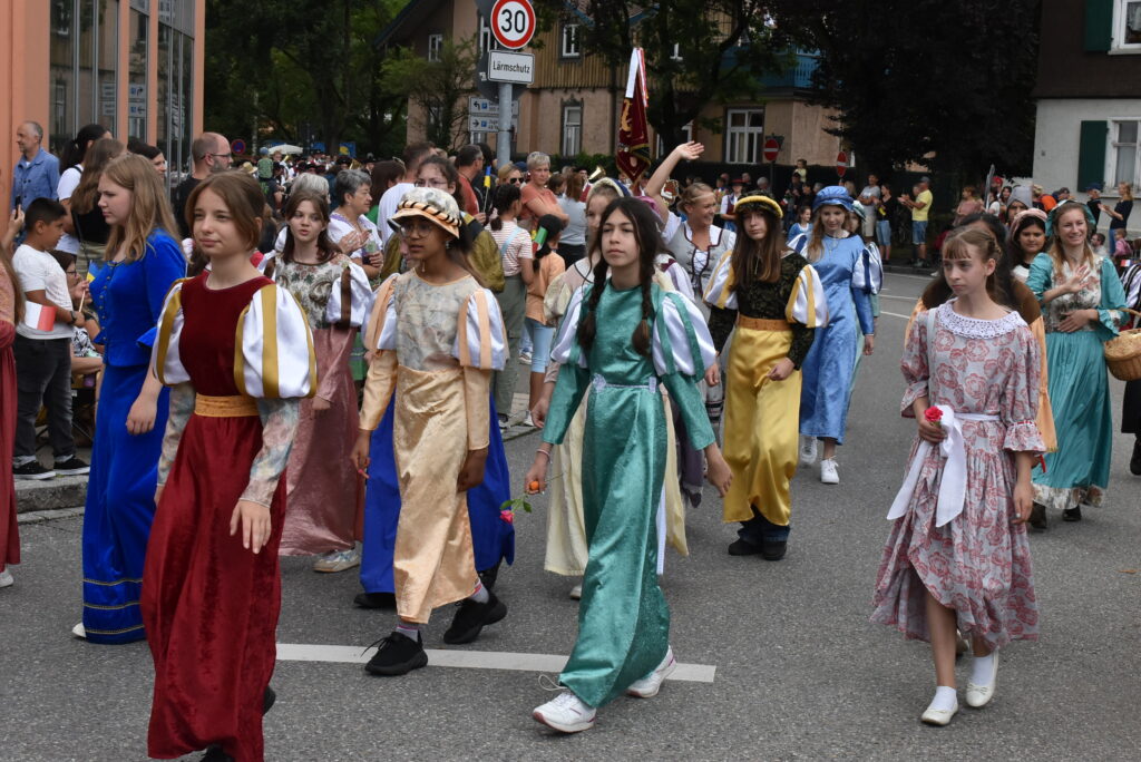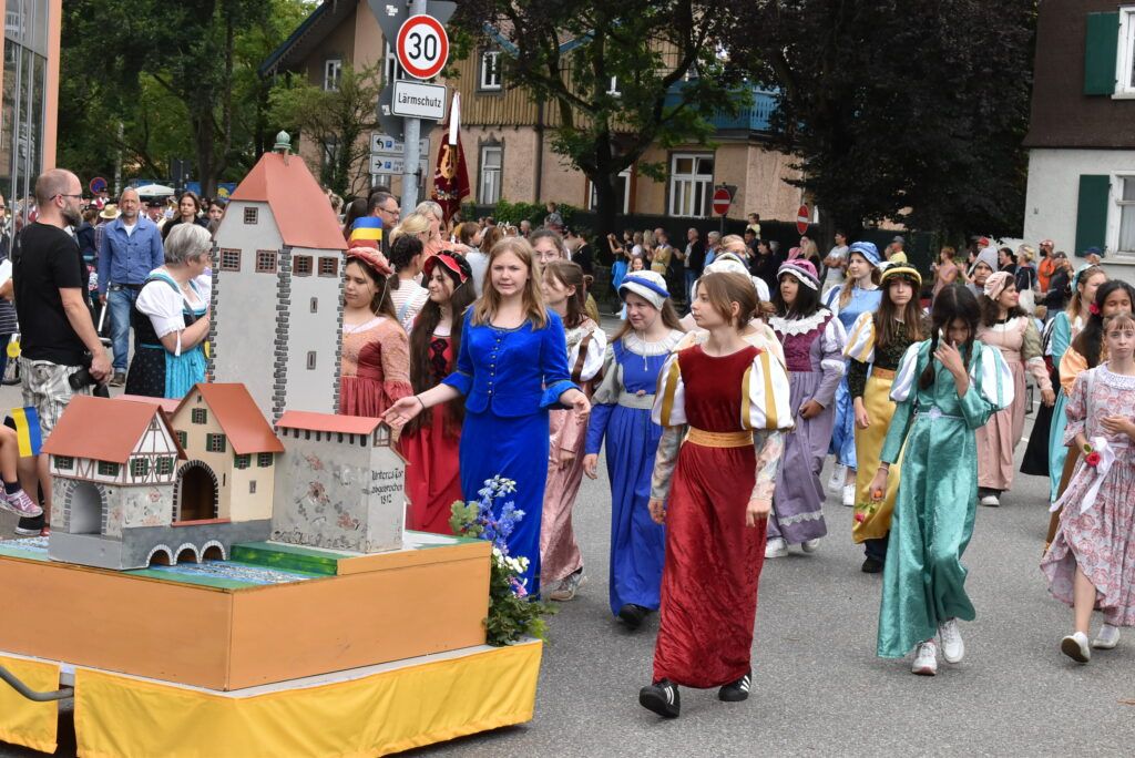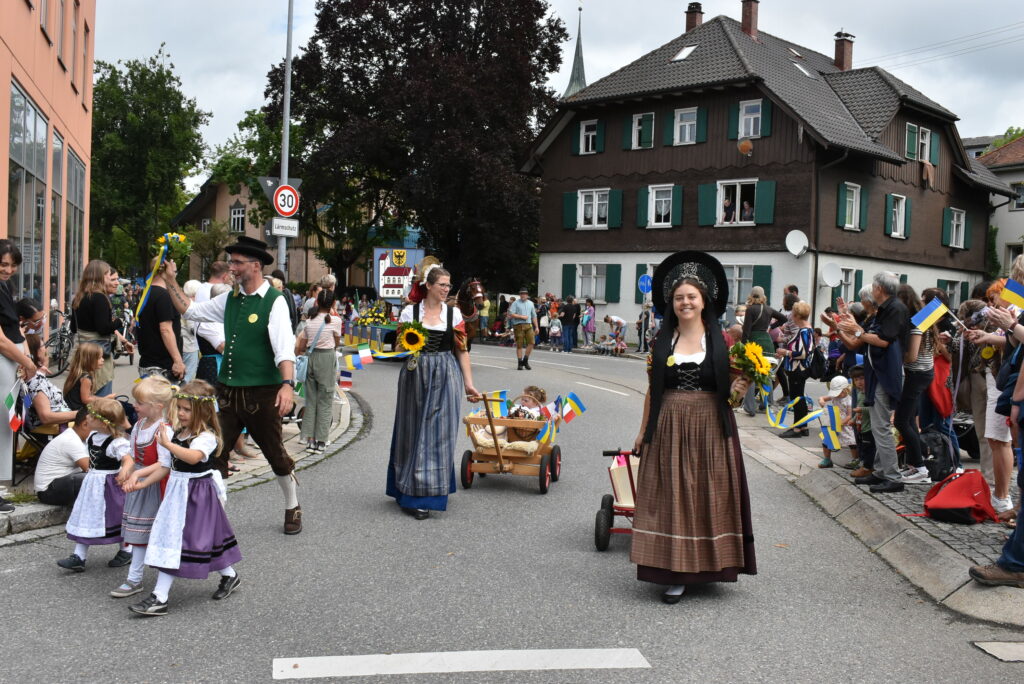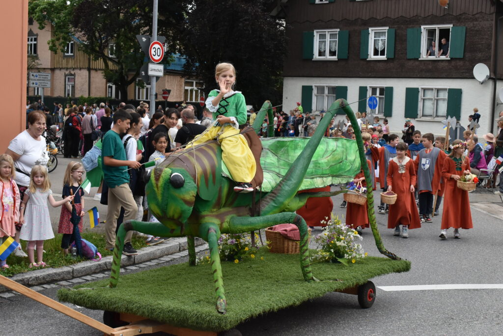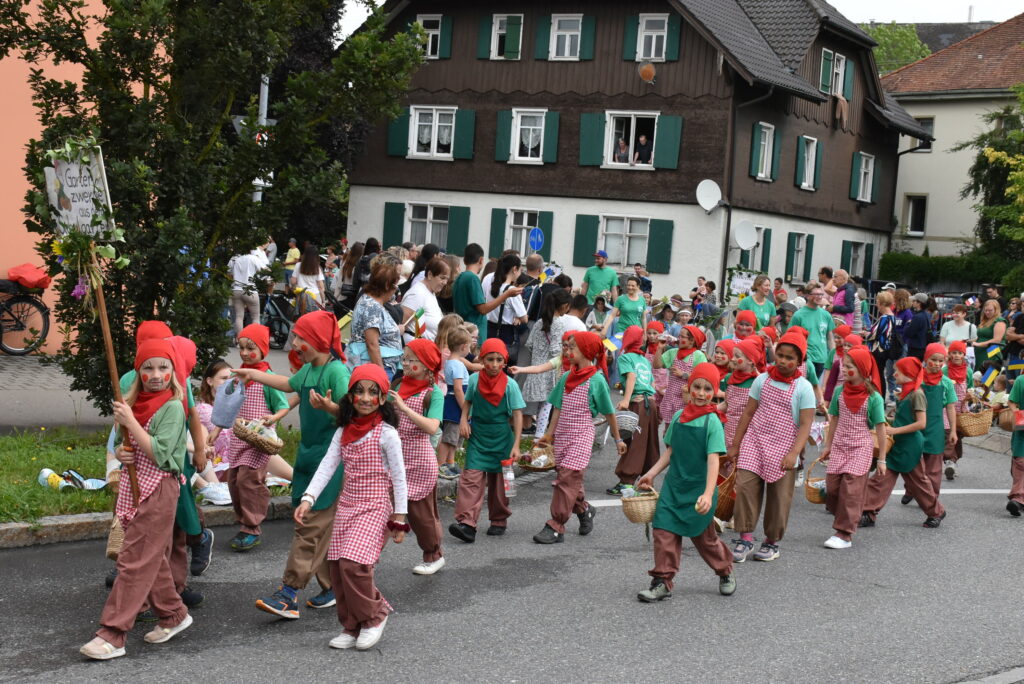 Herrlich-prächtige Gespanne, Wagen mit Blumen geschmückt, bereicherten den Kinderfestumzug. Auch die ganz neue Gruppe mit dem Wagen Haumühle und diverse Müller winkten Hunderten von Zuschauern zu, Fahnen wurden geschwenkt, und immer wieder fesche Musik dazwischen, denn es beteiligten sich alle Leutkircher Blasmusikkapellen sowie die Musikschule App mit Akkordeon- und Gitarrenklang. Die Stadtkapelle unter Stadtmusikdirektorin Emma Geser und der Stadtwappen-Wagen von Leutkirch bildeten das Ende eines wunderschönen Umzugs bei bestem Wetter am Kinderfest-Dienstag in Leutkirch.