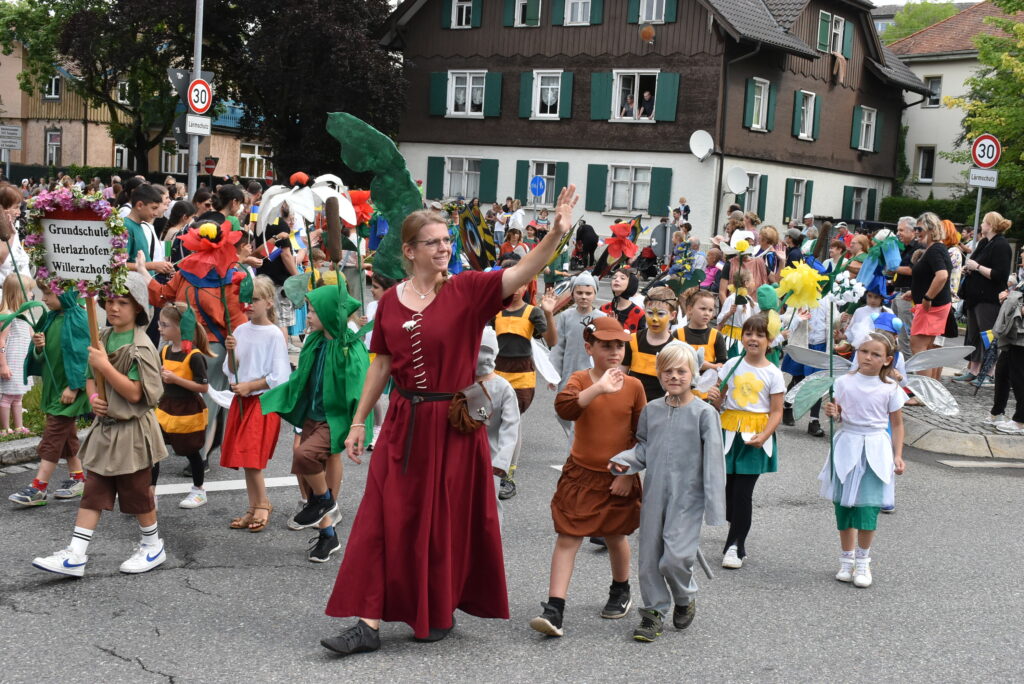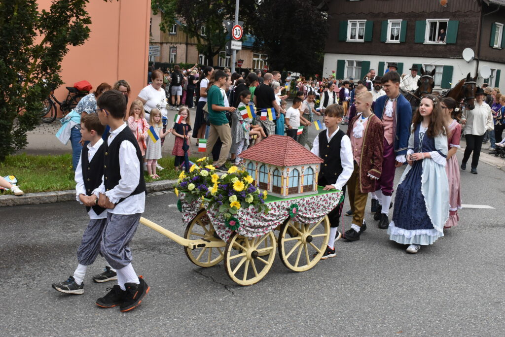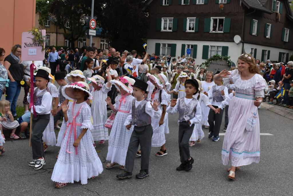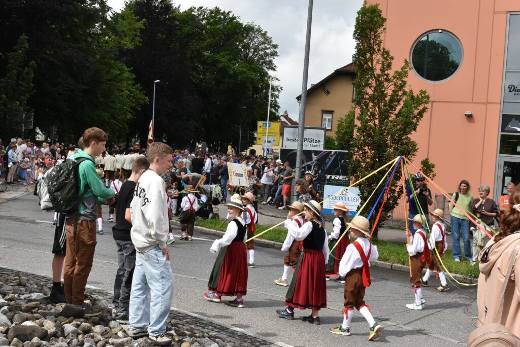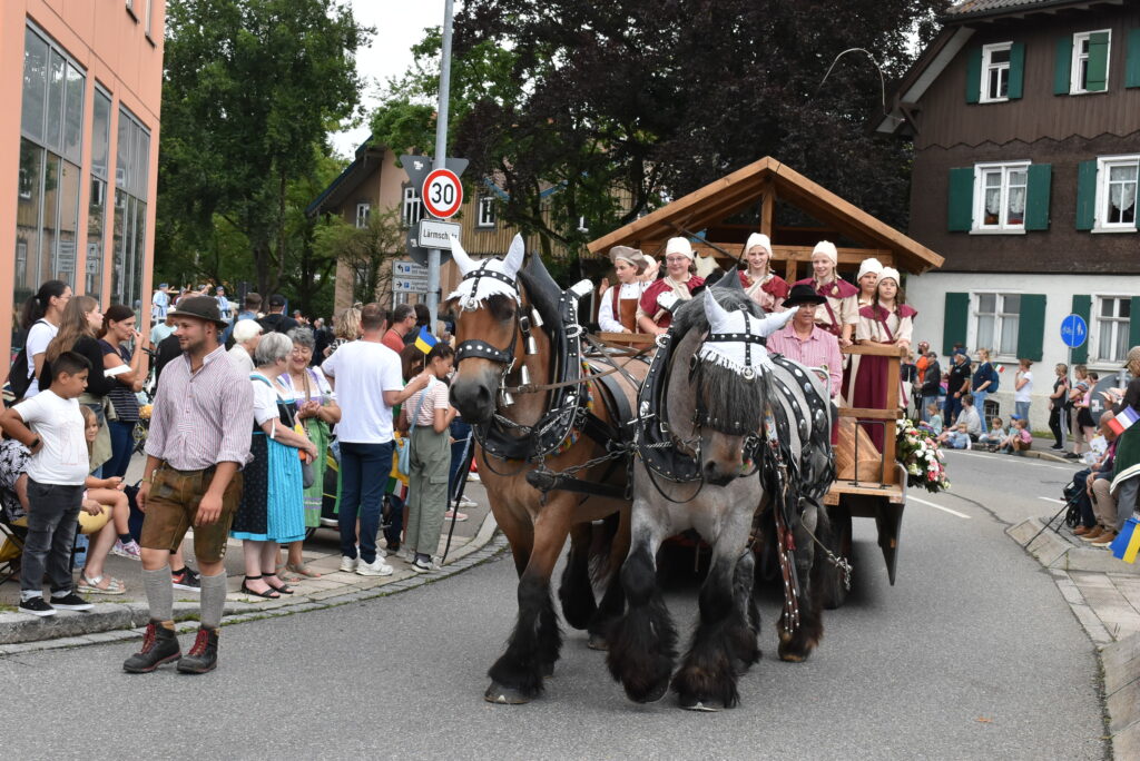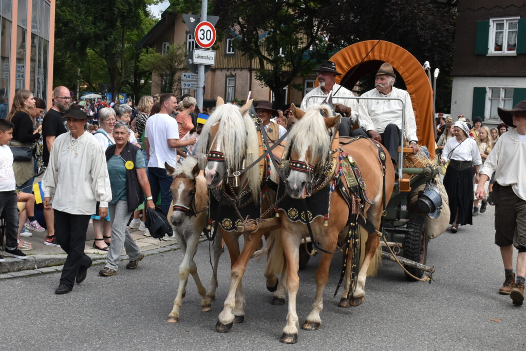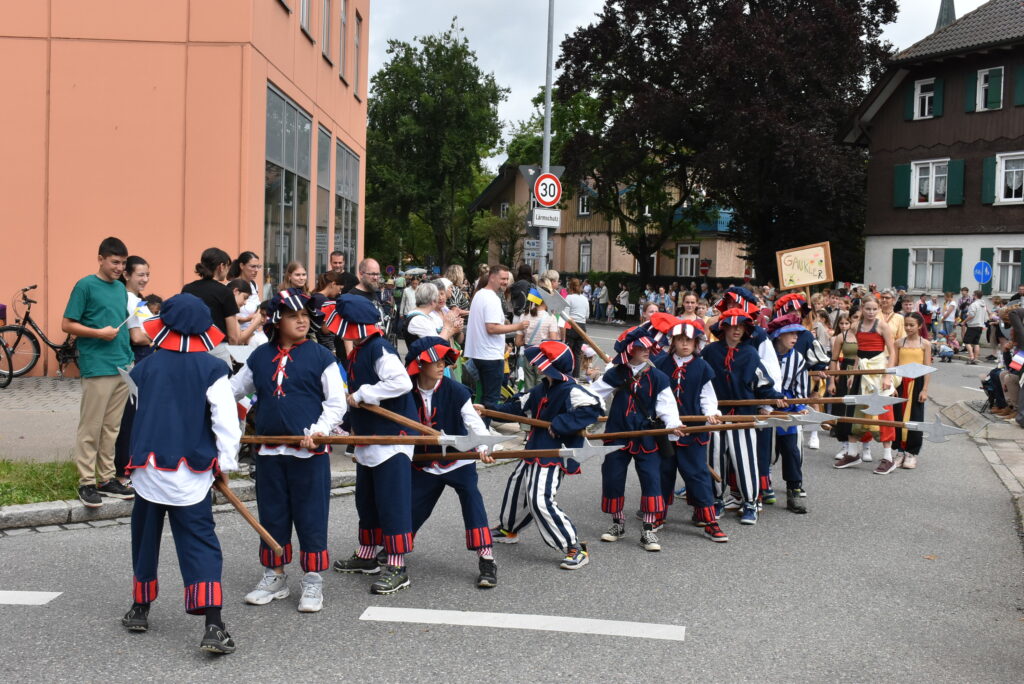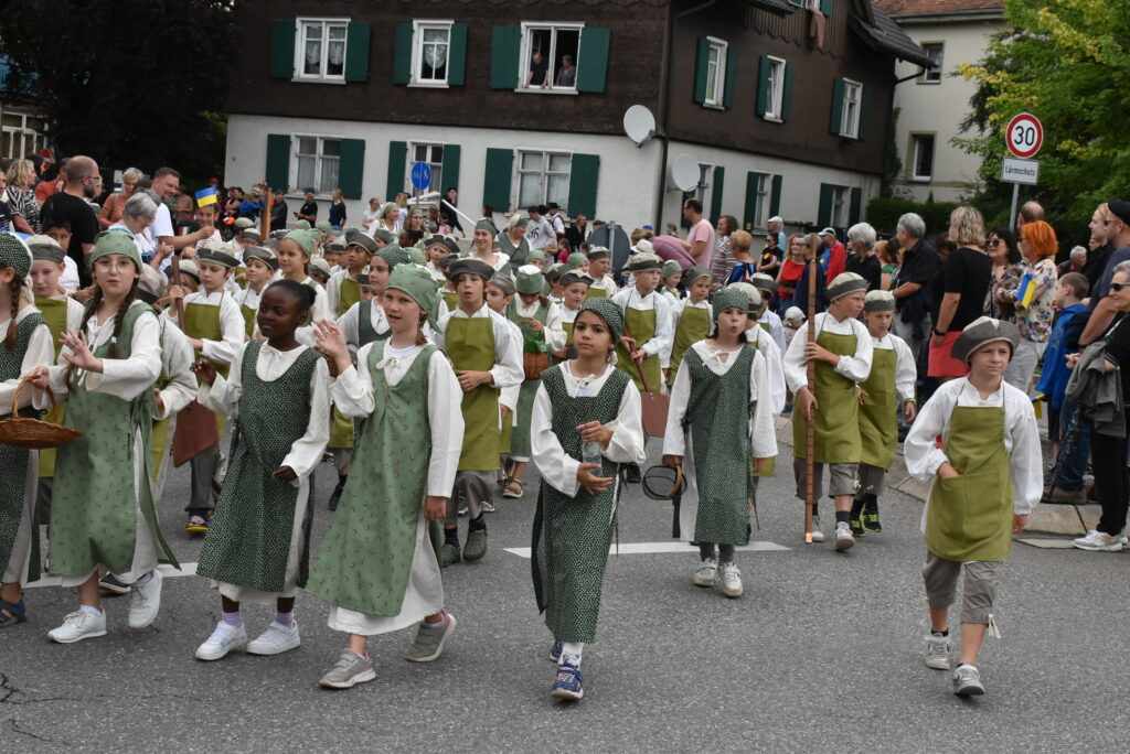 Herrlich-prächtige Gespanne, Wagen mit Blumen geschmückt, bereicherten den Kinderfestumzug. Auch die ganz neue Gruppe mit dem Wagen Haumühle und diverse Müller winkten Hunderten von Zuschauern zu, Fahnen wurden geschwenkt, und immer wieder fesche Musik dazwischen, denn es beteiligten sich alle Leutkircher Blasmusikkapellen sowie die Musikschule App mit Akkordeon- und Gitarrenklang. Die Stadtkapelle unter Stadtmusikdirektorin Emma Geser und der Stadtwappen-Wagen von Leutkirch bildeten das Ende eines wunderschönen Umzugs bei bestem Wetter am Kinderfest-Dienstag in Leutkirch.