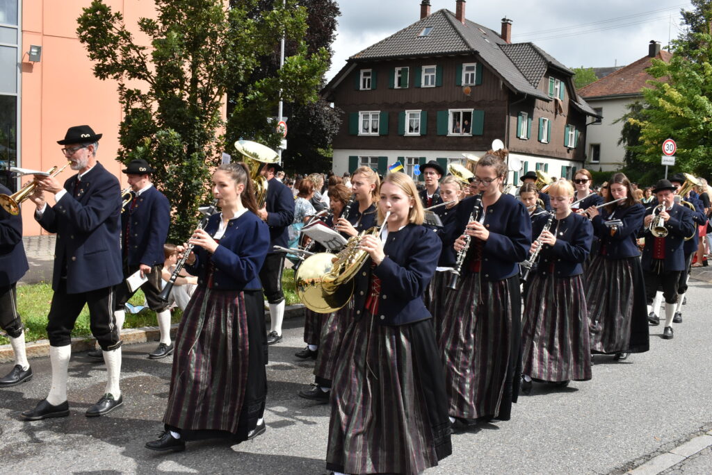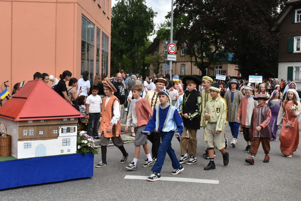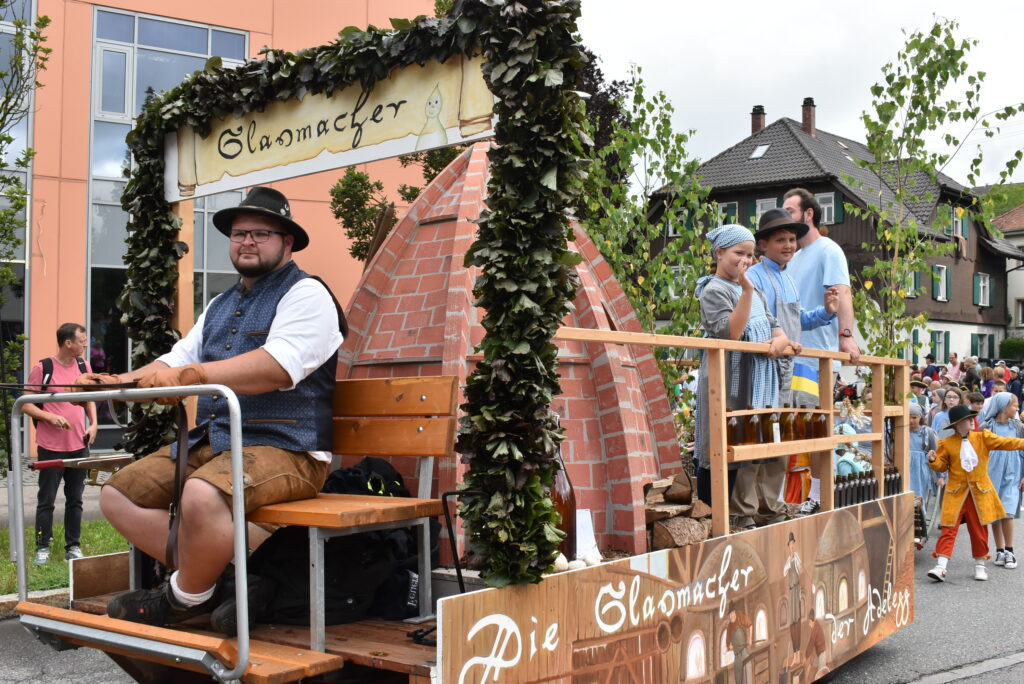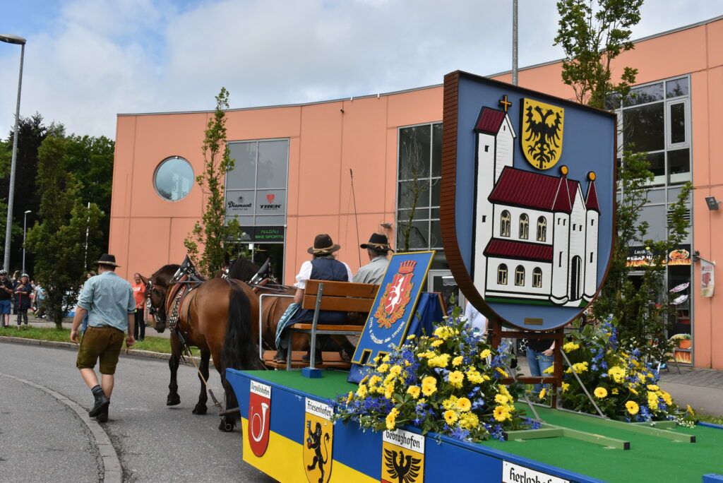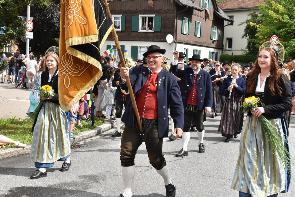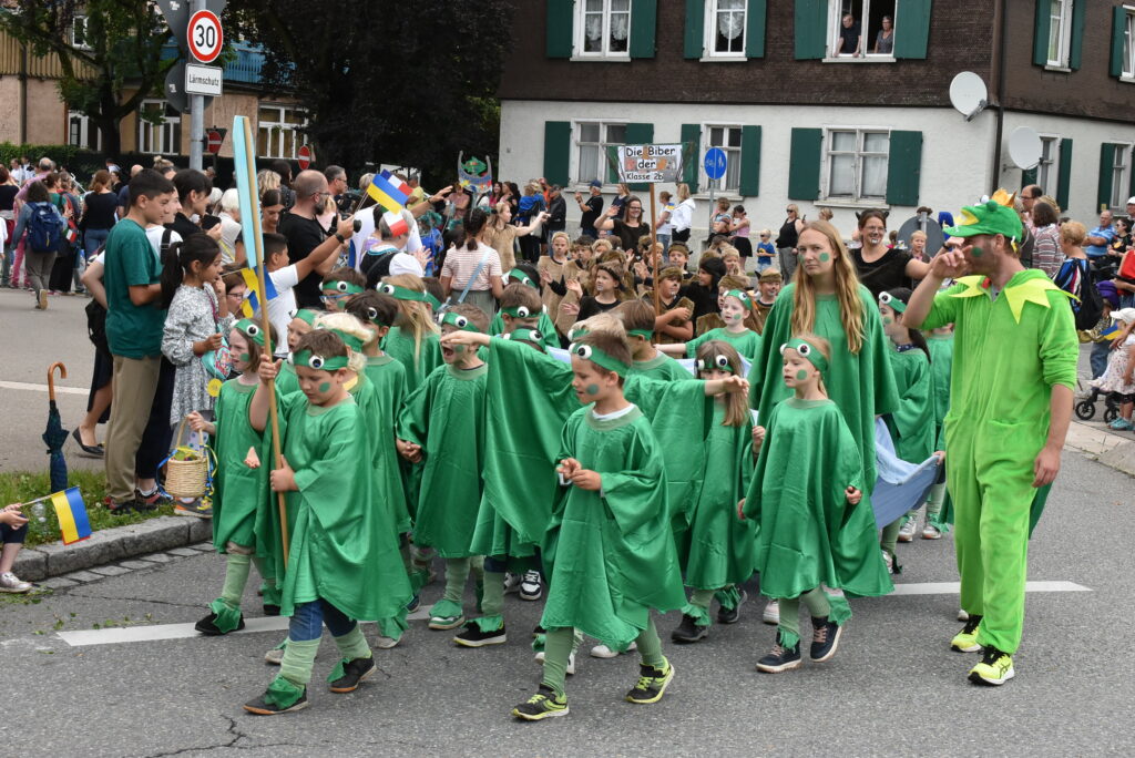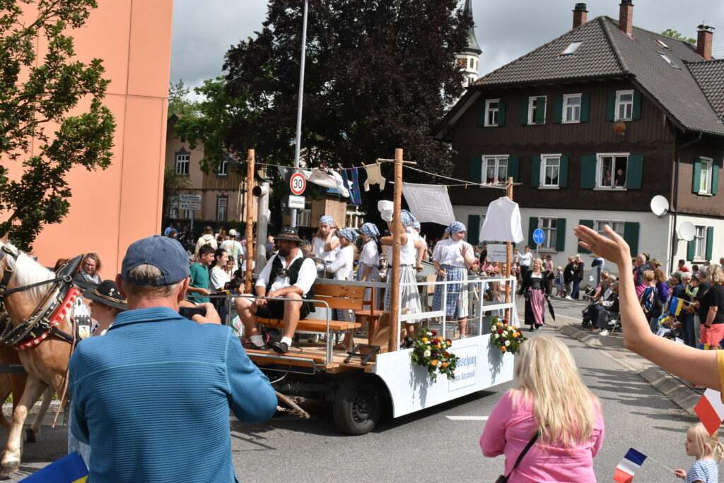 Herrlich-prächtige Gespanne, Wagen mit Blumen geschmückt, bereicherten den Kinderfestumzug. Auch die ganz neue Gruppe mit dem Wagen Haumühle und diverse Müller winkten Hunderten von Zuschauern zu, Fahnen wurden geschwenkt, und immer wieder fesche Musik dazwischen, denn es beteiligten sich alle Leutkircher Blasmusikkapellen sowie die Musikschule App mit Akkordeon- und Gitarrenklang. Die Stadtkapelle unter Stadtmusikdirektorin Emma Geser und der Stadtwappen-Wagen von Leutkirch bildeten das Ende eines wunderschönen Umzugs bei bestem Wetter am Kinderfest-Dienstag in Leutkirch.