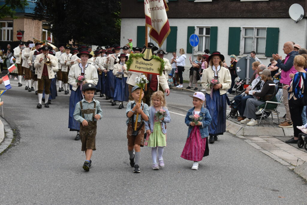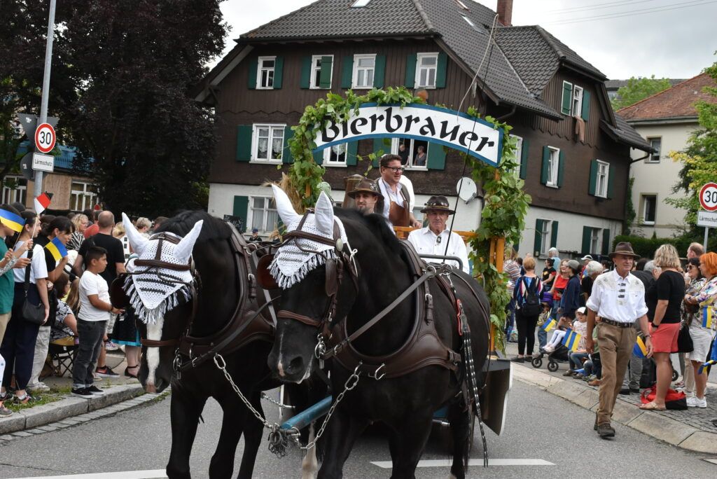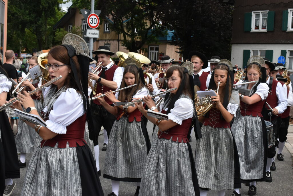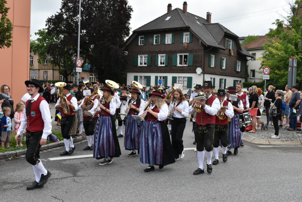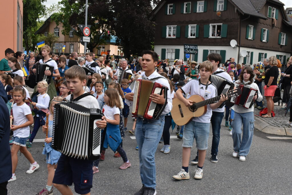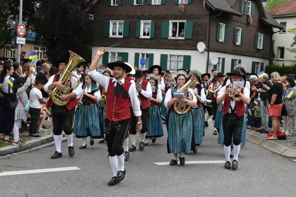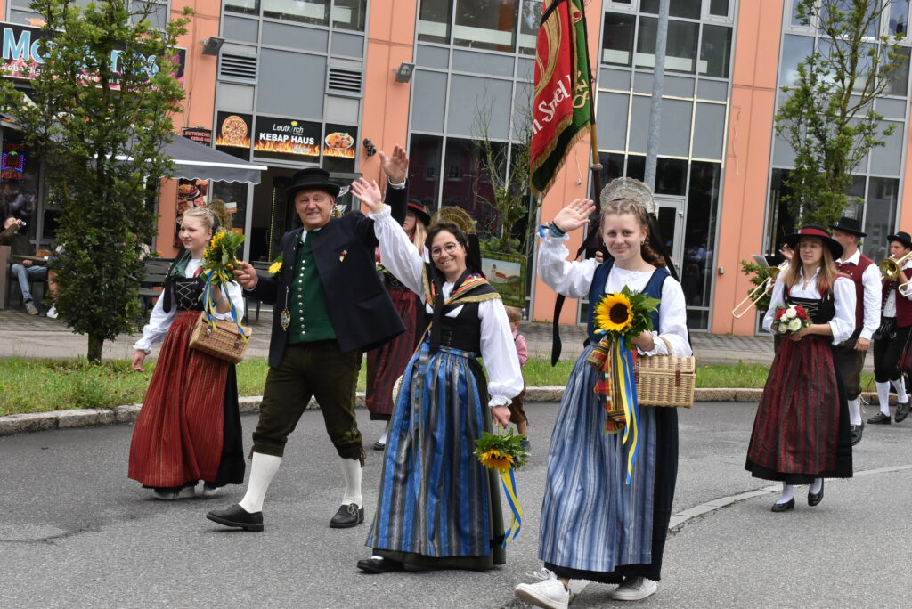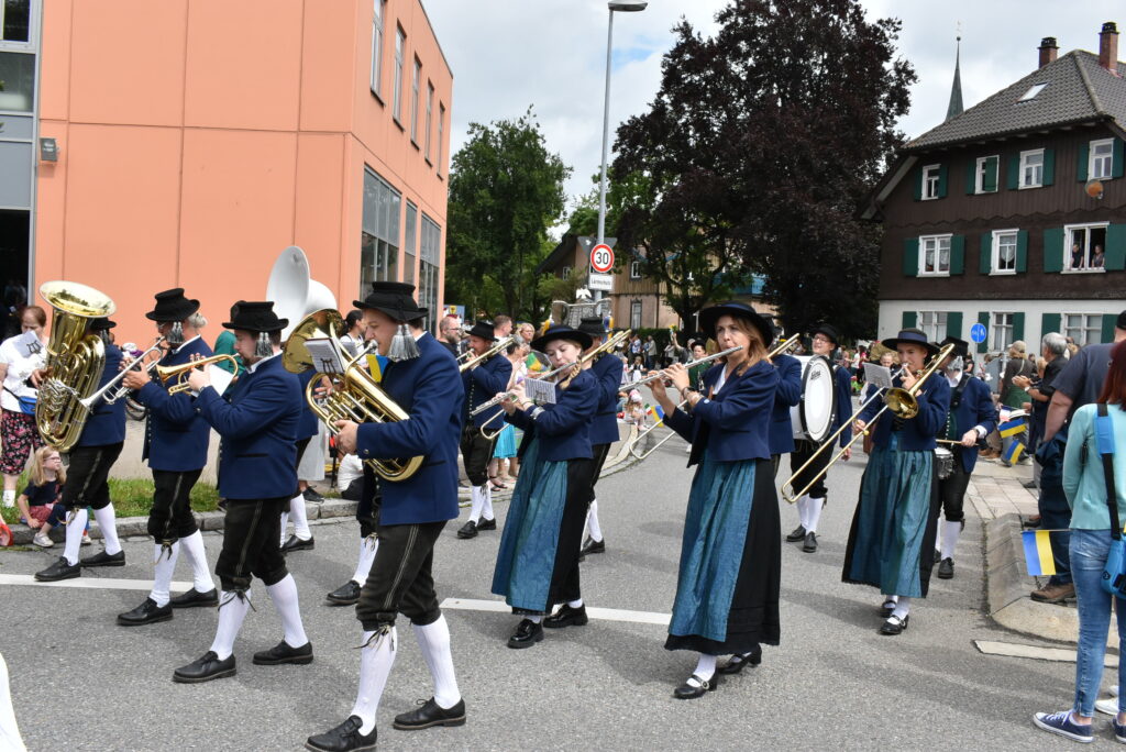 Herrlich-prächtige Gespanne, Wagen mit Blumen geschmückt, bereicherten den Kinderfestumzug. Auch die ganz neue Gruppe mit dem Wagen Haumühle und diverse Müller winkten Hunderten von Zuschauern zu, Fahnen wurden geschwenkt, und immer wieder fesche Musik dazwischen, denn es beteiligten sich alle Leutkircher Blasmusikkapellen sowie die Musikschule App mit Akkordeon- und Gitarrenklang. Die Stadtkapelle unter Stadtmusikdirektorin Emma Geser und der Stadtwappen-Wagen von Leutkirch bildeten das Ende eines wunderschönen Umzugs bei bestem Wetter am Kinderfest-Dienstag in Leutkirch.