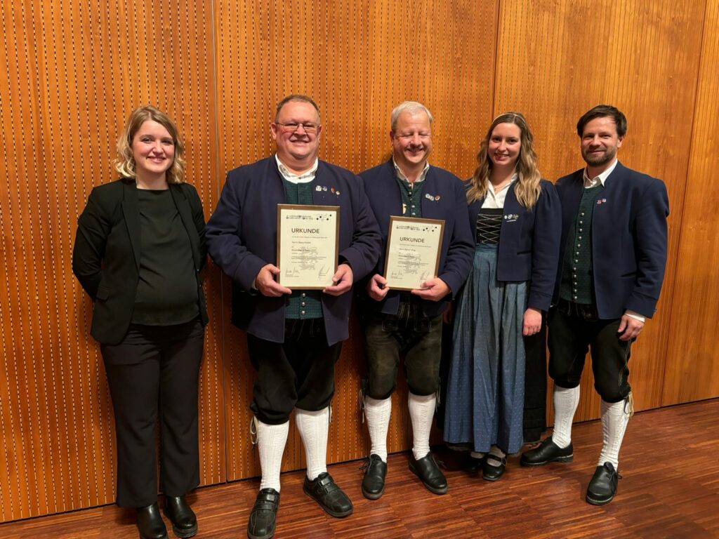 Die Ehrungen hatte Rudi Hämmerle vom Blasmusikkreisverband sehr amüsant übernommen. Für zehn Jahre Mitgliedschaft wurden Johanna Janser, Lukas Bodenmüller und Niklas Hübner geehrt. Die Edelnadel mit Gold und Diamant erhielten zwei besonders treue Musikanten: Klaus Kieble und Rainer Krug für 50 Jahre Engagement und Ehrenamt. Sie spielen beide die Tuba.
