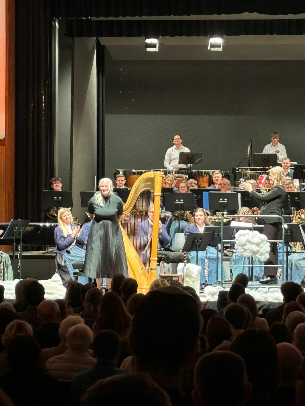 Weitere Höhepunkte folgten: Die professionelle Märchenerzählerin Catriona Blanke trat auf und fesselte das Publikum mit einer spannenden Geschichte von Träumen und vom Glück, das man finden kann. Die Harfen-Solistin Konstanze Kraus betrat ebenfalls die Bühne fürs nächste Stück, das sie zusammen mit der Stadtkapelle darbrachte. „Store Sommer“, Klänge voller Licht, Freude, Friede und Hoffnung war eine ganz besondere Art Uraufführung in der Festhalle, die viel Applaus bekam. Das Publikum durfte auch ein Solo-Harfenstück genießen und dann das Ende des Märchens erfahren.