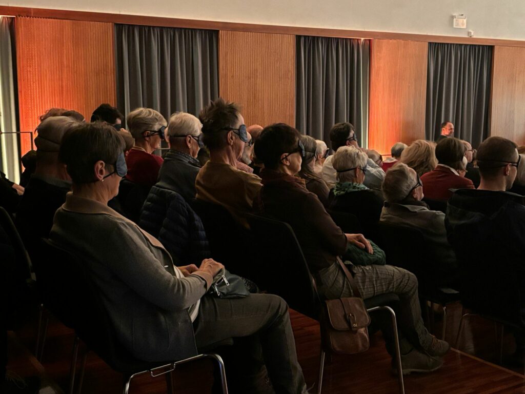 Dann wurde es spannend. Jeder Besucher hatte eine Augenmaske erhalten, die nun aufgesetzt wurde. Beim folgenden Titel „Stardance“ kamen verschiedene Rhythmen und wirbelnde Klänge wunderbar zur Geltung. Einige Bläser hatten sich rechts und links seitlich des Publikums plaziert, so dass ein Rundum-Konzerterlebnis mit hörbarem Sternenhimmel wahrgenommen werden konnte.