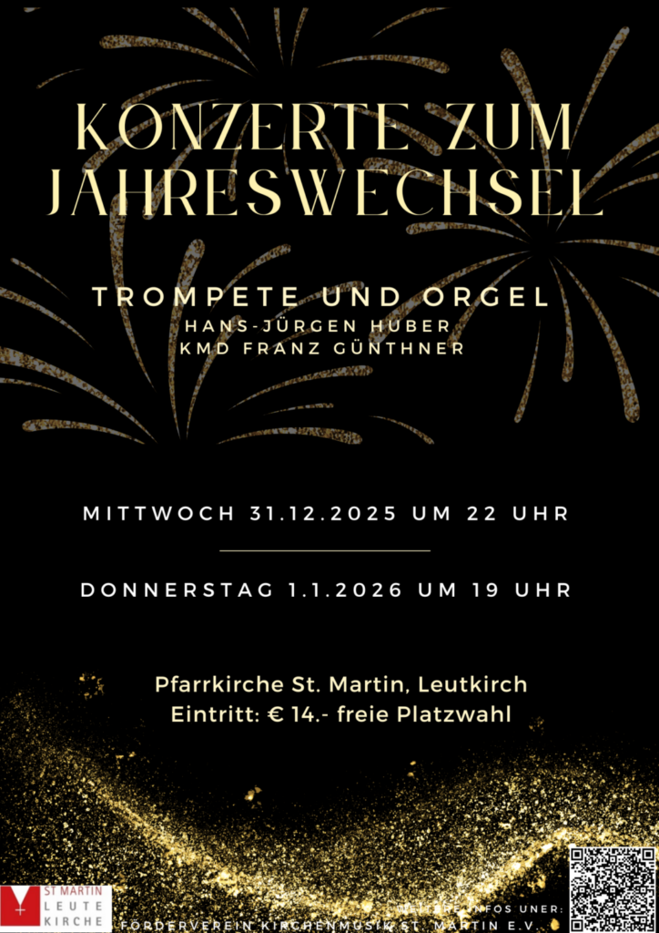 Leutkirch – Nach Auftritten in großen europäischen Städten und internationalen Festivals läuten auch 2025 traditionell wieder Hans Jürgen Huber an der Trompete und Kirchenmusikdirektor Franz Günthner an der Orgel ein neues Jahr ein. Das Duo begeistert sein Publikum jedes Jahr aufs Neue mit außer-gewöhnlicher technischer Perfektion und raffinierter Programmauswahl. Das traditionelle Silvesterkonzert in St. Martin Leutkirch findet am 31. Dezember um 22.00 Uhr statt, während das Neujahrskonzert am 1. Januar um 19 Uhr beginnt – beide Veranstaltungen präsentieren dasselbe abwechslungsreiche Programm.
