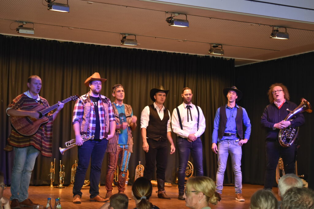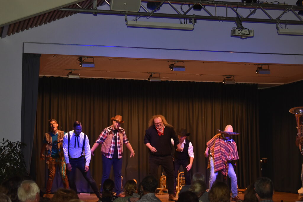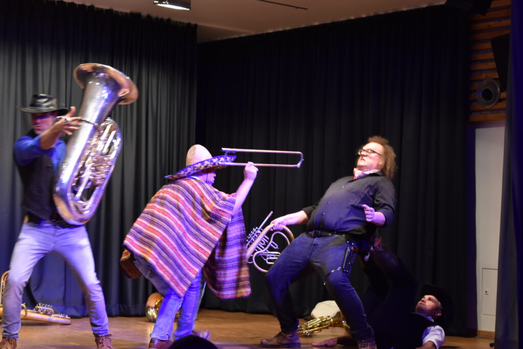 Auch ein Western-Gigolo mit Pokerface und immer als Womanicer stets bereit mit Tenorhorn, Bariton, der beim Duell mit Instrumenten-Teilen fast gnadenlos erschossen worden wäre: Florian Weder kam gut an. Dieter Schuhmacher alias Henry Fonda, im langen schwarzen Mantel, einer der nicht viel redet, aber mehr Party möchte, brillierte am Waldhorn, und nicht zuletzt ist da Thomas Wolf aus Unterzeil als BOSS der Band, deren Arrangeur mit vielen verrückten Ideen.
