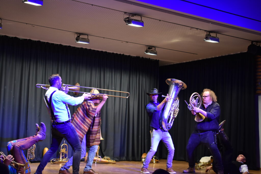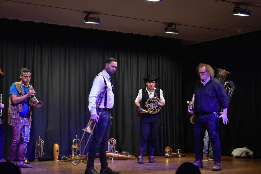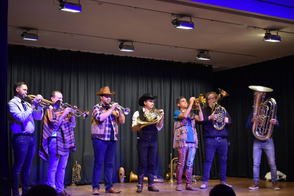 Zwischen den Stücken wird ziemlich Theater bzw. Comedy gemacht. Es sind die Grimassen, die Mimik und Gestik, ja manchmal auch Akrobatik, mit wenig Worten sagen sie alles und amüsieren das Publikum köstlich. Seit mehr als zehn Jahren stehen sie auf den Bühnen der (Allgäuer) Welt, die sieben Blechblas-Künstler kommen aus den Orten Aichstetten, Diepoldshofen, Engelboldshofen, Leutkirch, Unterzeil und Willerazhofen. Sie spielen teils auf antiken Instrumenten und nicht wenige switchen zwischen Posaune, Tenorhorn, Trompete hin und her und so mancher Ton ist auch mal bewusst schräg.