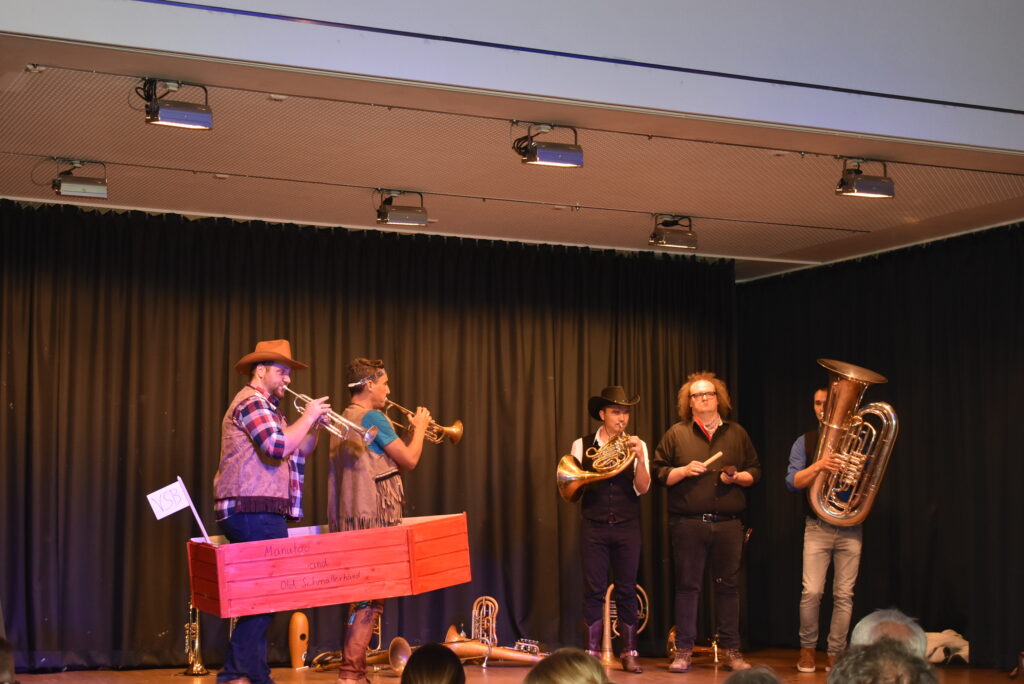 Indianer-Häuptling Mannetou, Manfred Schuhmachers Parodie mit Trompete auf die gute, stets gerechte Rothaut Winnetou, spielte mit dem vermeintlichen Greenhorn Old Schmetterhand (Manuel Haag, Trompete), der seine deutsche Herkunft im Wilden Westen nicht verbergen konnte. Die dritte Trompete spielte der kleine Mexikaner mit großem Hut, Christian Wolf. (Mike) Langegger alias Billy the Kid, der ziemlich erwachsen wirkte mit seiner großen Tuba, deren Gewicht mindestens 10 Flaschen Whisky entspricht.