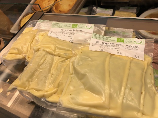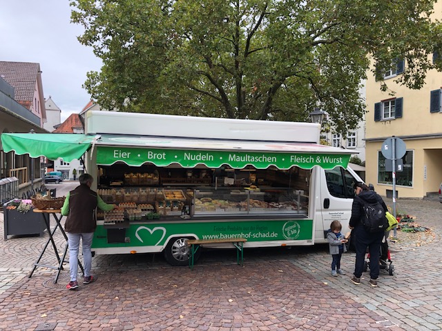 Eigenproduktion kann zum Beispiel auch dabei helfen, „Vieh von der Weide” zu genießen. Also nicht aus Massentierhaltung. Elisabeth Schad von der gleichnamigen Betriebsgemeinschaft in Steinhausen an der Rottum verheißt sogar noch mehr. Die Anbieterin, die direkt schräg gegenüber dem „neuen“ Rathaus ihren Lieferwagen unterhält und unter ihrer Kundschaft schon mal „Miss Läb‘rkäswecka” tituliert wird, erzählt, „dass wir dran sind, ein eigenes Schlachthaus zu bauen”. Vielseitig: Die leckeren Maultaschen bei ihr gibt’s auch in vegetarischer Variante.
