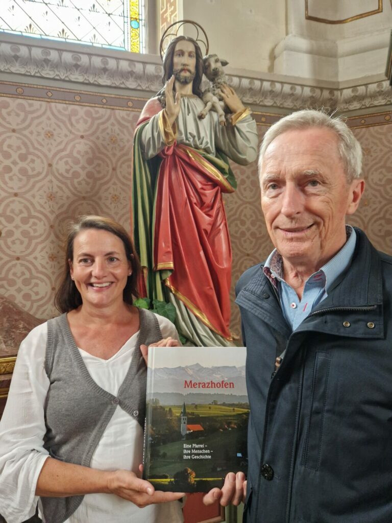 Die Autoren Melanie Marka und Berthold Haas präsentieren die frisch erschienene Chronik zur Geschichte von Merazhofen vor der Statue des Guten Hirten in der Pfarrkirche. Foto: KGM