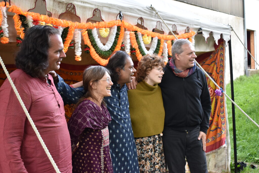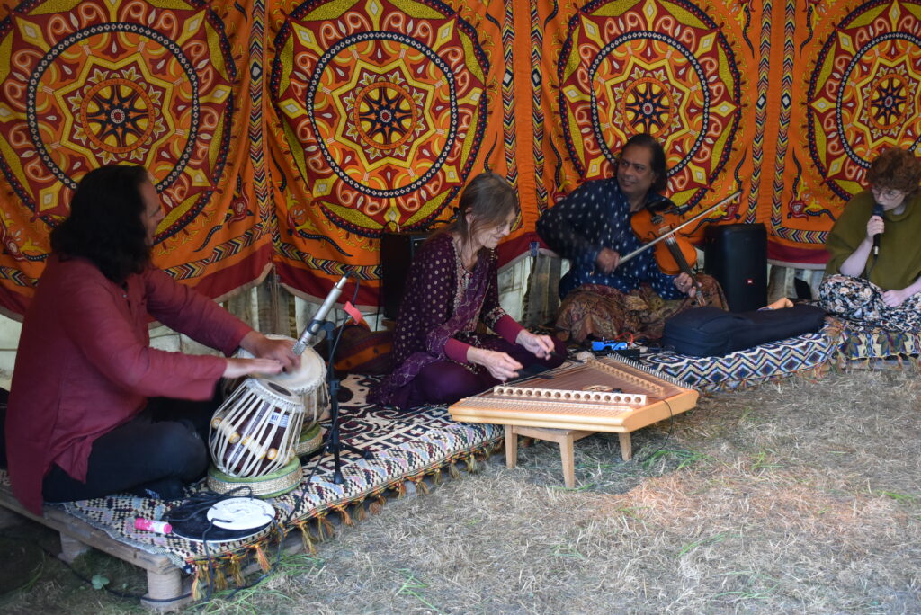 Das international besetzte Weltmusik-Ensemble SOUL SANGAM legte auf seiner Europa-Tournee zwischen Norwegen und Slowenien einen kleinen Zwischenstopp ein und trat für 90 Minuten in Dilpersried bei Lautrach auf. Kleine Bühne, große Musik, Weltmusik vom Feinsten. Petra Rehwald hatte eingeladen, ein kleines Zelt aufgebaut, hübsch bunt dekoriert.
