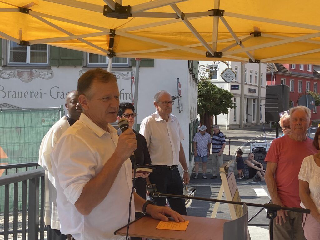 Nicht auf der Bühne befand sich auch Bauleiter und Bauüberwacher Gebhard Bareth (Bild). Regierungspräsident Klaus Tappeser aus Tübingen lobte ihn hörbar. Die neu errichtete Mohrenbrücke sei Bareths berufszeitliche Krönung – so dass der Mann zum 1. November in Rente gehe.
