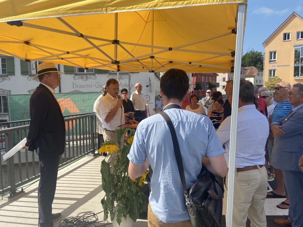 Leutkirch – Viel Sonnenlicht leuchtete und viel politische Prominenz aus Leutkirch und drüber raus strahlte. Am Freitagvormittag kurz vor 11.00 Uhr schnappten etliche Scheren zu, um das symbolische Sperrband auf der Mohrenbrücke zu zerschneiden. Weihwassertropfen des kirchlichen Segens kurz davor hatten so manch wichtigem Besuch etwas Kühlung vor der sengenden Hitze verschafft.