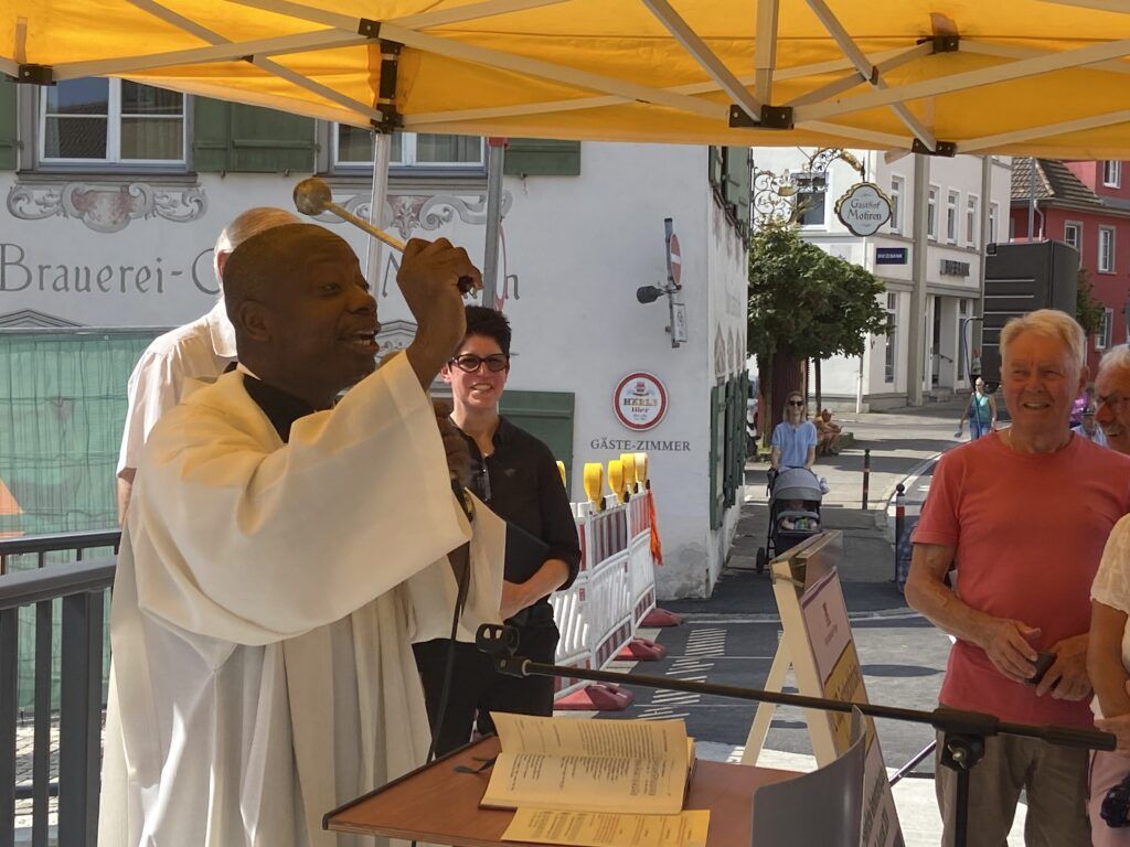 Heißt in Zahlen: 15 Monate Bauzeit – “für so eine Brücke eher kurz” (Klaus Tappeser), 3 Millionen Euro Baukosten vom Land Baden-Württemberg und nochmals 1,4 Millionen von der Stadt Leutkirch – etwa für Leer-Rohre der Fernwärmeleitungen oder eine Bushaltestelle auch für Leute “mit Einschränkungen” (Henle). “Wir haben’s also geschafft – trotz Hochwasser”, lobte Regierungspräsident Tappeser. Seine Rede hatte er mit dem Ratschlag begonnen: „Gehen Sie ein bißle in den Schatten”. Dann hielt sich Tappeser vergleichsweise kurz. Da wirkte das kühle Weihwasser des katholischen Priesters noch treffsicherer. Großzügig versprengte er es großzügig auf das erkennbar dankbare Publikum.