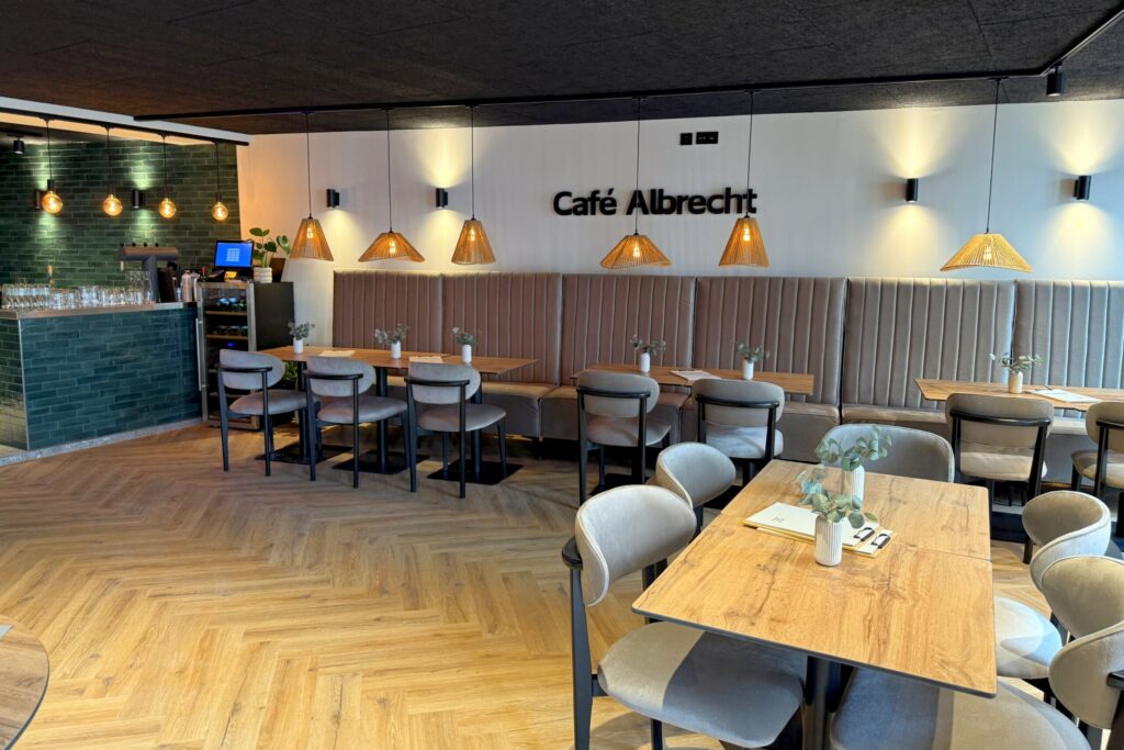 Das Café Albrecht setzt auf ein Ganztageskonzept: Vom Frühstück und Brunch am Vormittag über einen Mittagstisch mit saisonalen Gerichten bis hin zum Café-Betrieb am Nachmittag mit Kuchen und Kaffeespezialitäten. Am Abend verwandelt sich das Lokal in eine Pizzeria mit frischen Salaten und weiteren Speisen. Der Gastraum bietet mehr als 30 Sitzplätze, ergänzt durch rund 50 weitere Plätze im Außenbereich vor dem Café und dem Rathaus.