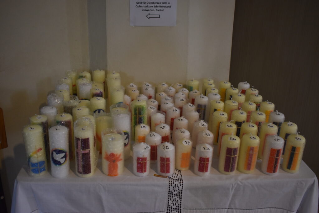 Rund 20 Frauen haben wieder ehrenamtlich etwa 1000 Kerzen von Hand sehr kreativ gestaltet, so ist für jeden Geschmack etwas dabei. Man kann die Osterkerzen verschenken oder sich selber schenken, die Kosten liegen bei 3,50 bis 7 Euro. Der ganze Erlös geht ohne Verwaltungskosten direkt an die Missionsstation von Spiritanerbruder Peter Hötter in Tansania für Kinder, Schulkinder und Waisen, ebenso an Bischof Augustino Shao nach Sansibar für Ausbildungsprojekte von Jugendlichen dort.