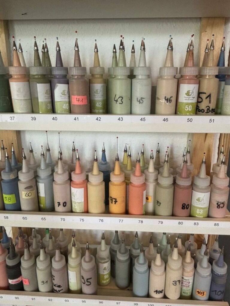 Gut 100 Farbtöne stehen zur Verfügung, Pinsel jeder Größe und fast 60 Sitzplätze. „Zweieinhalb Stunden planen wir für einen Besuch ein. Für Kunden, die länger brauchen, findet sich eine Lösung. Im Notfall bucht man einen weiteren Termin. Am besten, man reserviert sich seinen Wunschtermin im Voraus, inzwischen geht das ganz einfach über unsere Homepage“, erklären die beiden Frauen. Vor allem in Ferienzeiten sei das sehr wichtig.