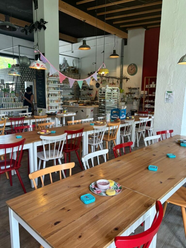 Die Ladenbesitzerinnen freuen sich auch über eine verlässliche und treue Klientel, nämlich über die Center-Parcs Allgäu-Touristen, die das Angebot sehr gut annehmen würden – und das nicht nur als Schlechtwetterprogramm. „Es herrscht immer eine angenehme Atmosphäre, es ist einfach was ganz Besonderes hier“, so drückt es eine Stammkundin aus, die gerade eine Kuchenplatte zum Geburtstag einer Freundin malt. Ein kleines, verstecktes Highlight ist die Terrasse hinterm Haus direkt an der Eschach. Hier kann man auch mal eine kleine Pause machen, bei Kaffee oder kühlen Getränken.