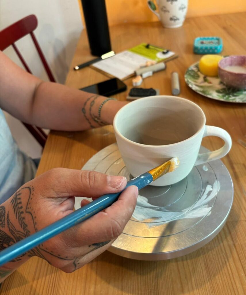 Eine auf einer Drehscheibe stehende Tasse wird bemalt.