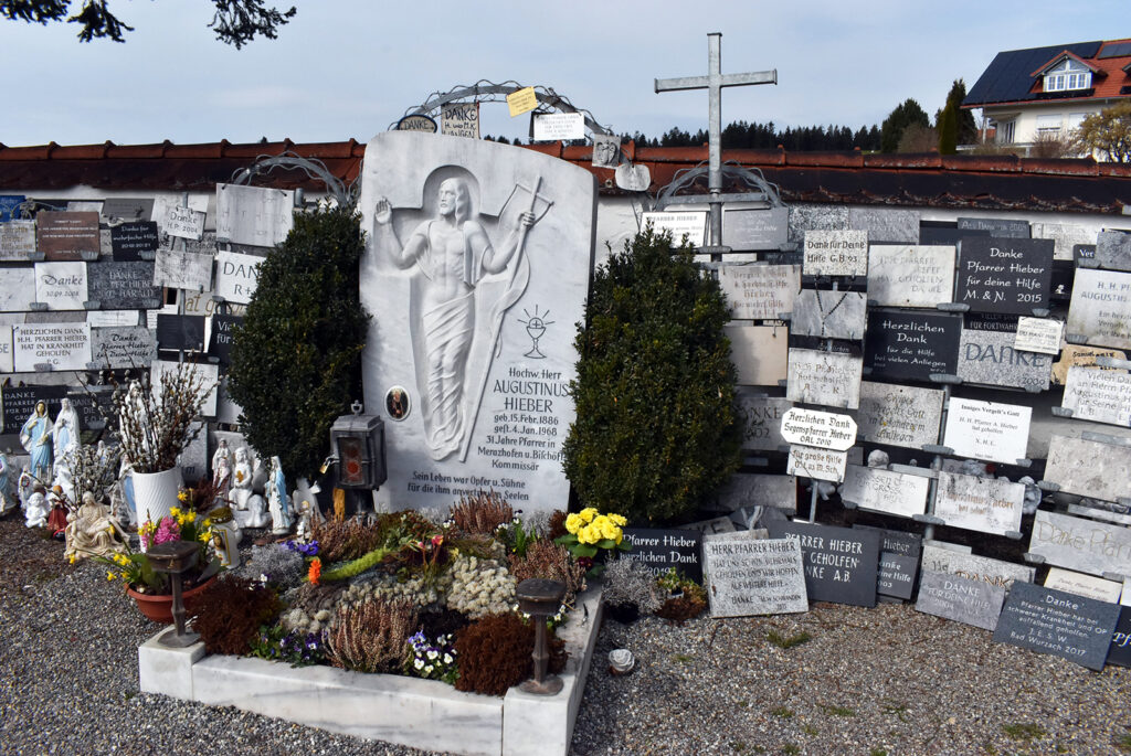 Pfarrer Hieber hat bis 1968 in Merazhofen gelebt und gewirkt. An seinem Grab sind unzählige Dankestafeln als Beweis für sein Wirken bei Sorgen und Anliegen.