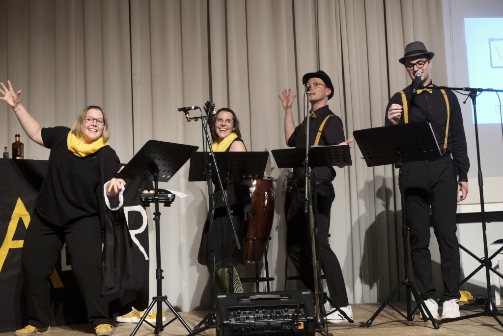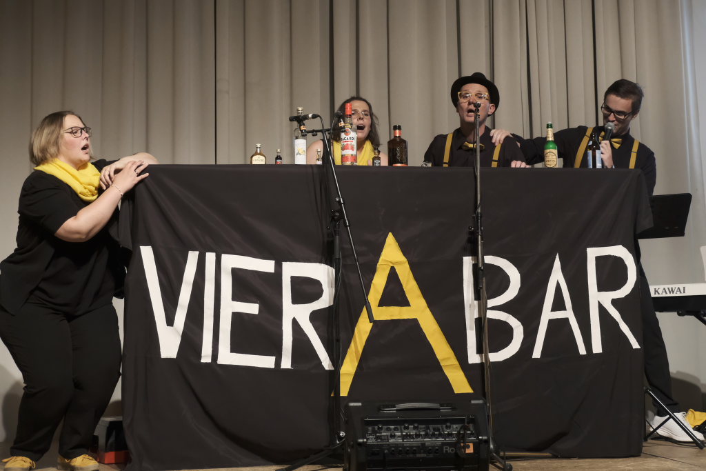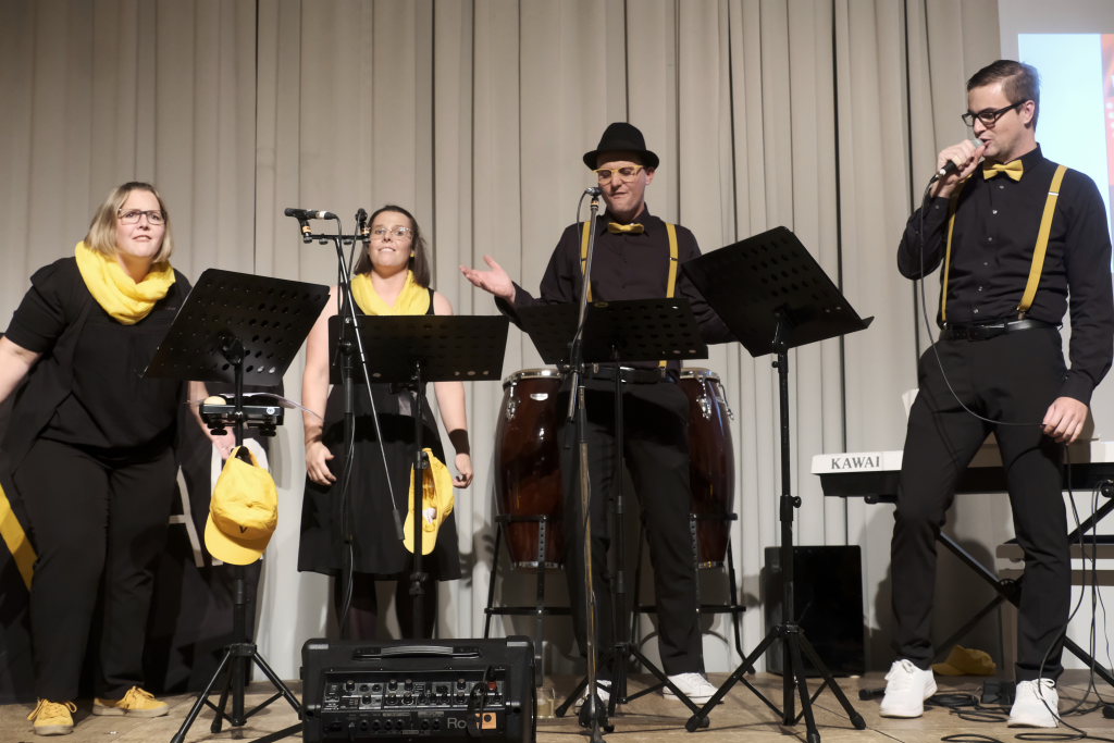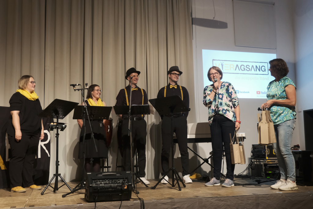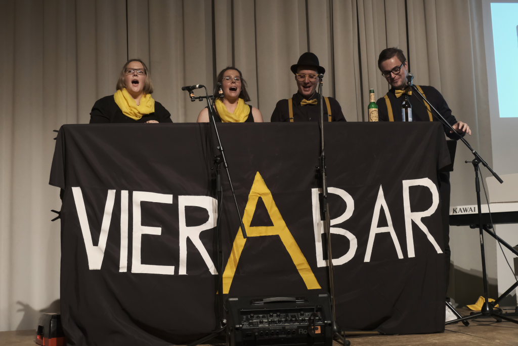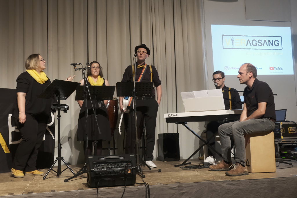 Und so stiegen die Vier mit einem Werbesong-Medley, an dessen Ende sie gleich noch ein Erinnerungs-Selfie anhingen, in ihr Abenteuer ein. Aus dem Hit der Toten-Hosen „Altes Fieber“ wurde bei Vieragsang mit feinsinnigem schwäbischem Humor das Lied der schmerzenden Glieder. Wo ihre musikalischen Wurzeln liegen, zeigten sie bei dem afrikanischen Gospel Mamaliye, begleitet von Klaus Bendel am Cajon. Ihren wunderbaren Humor präsentierten sie dann auch bei ihrer philosophischen Betrachtung darüber, warum englische Titel soviel erfolgreicher sind als deutsche.