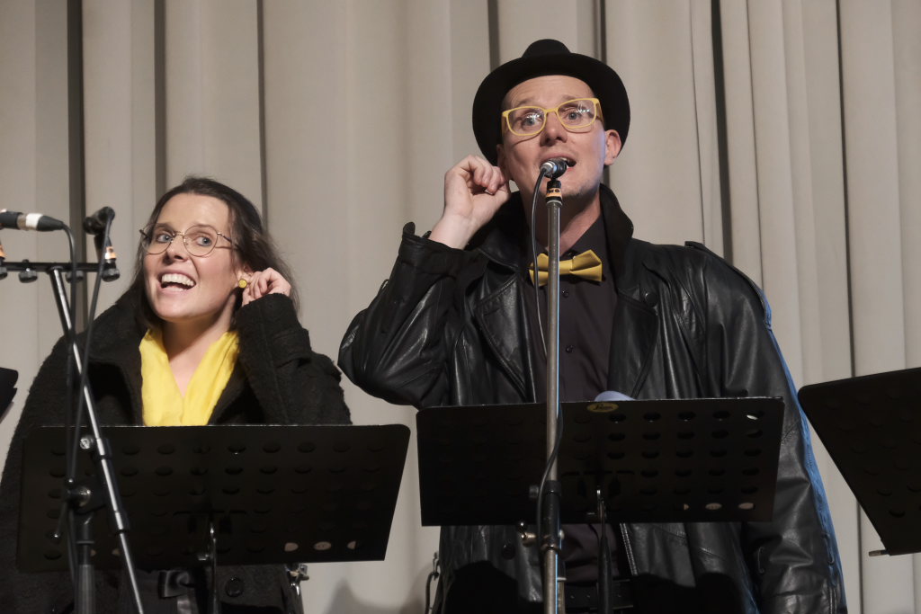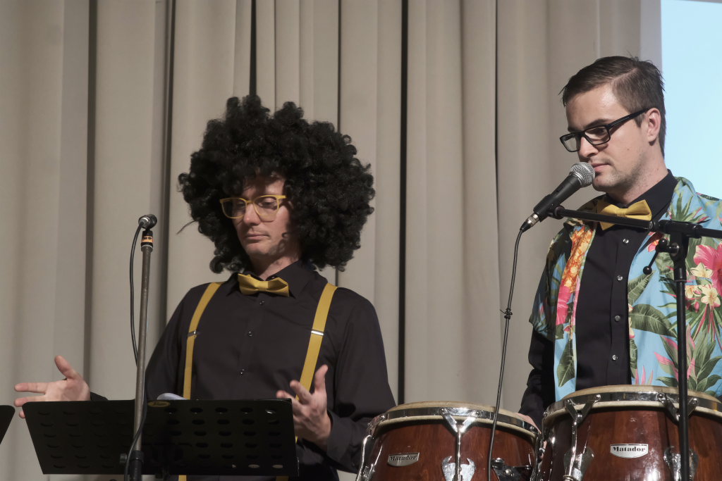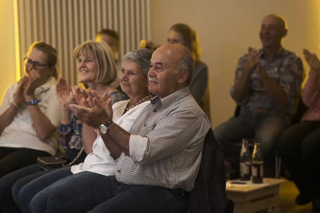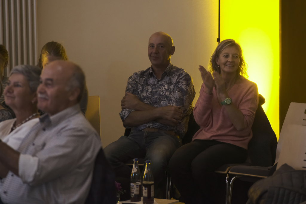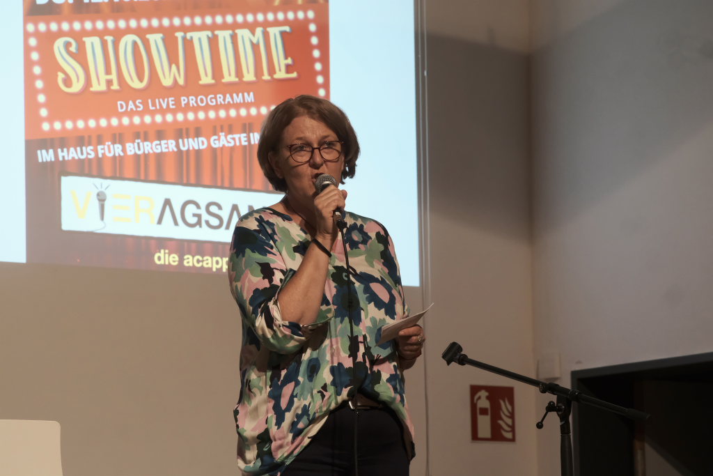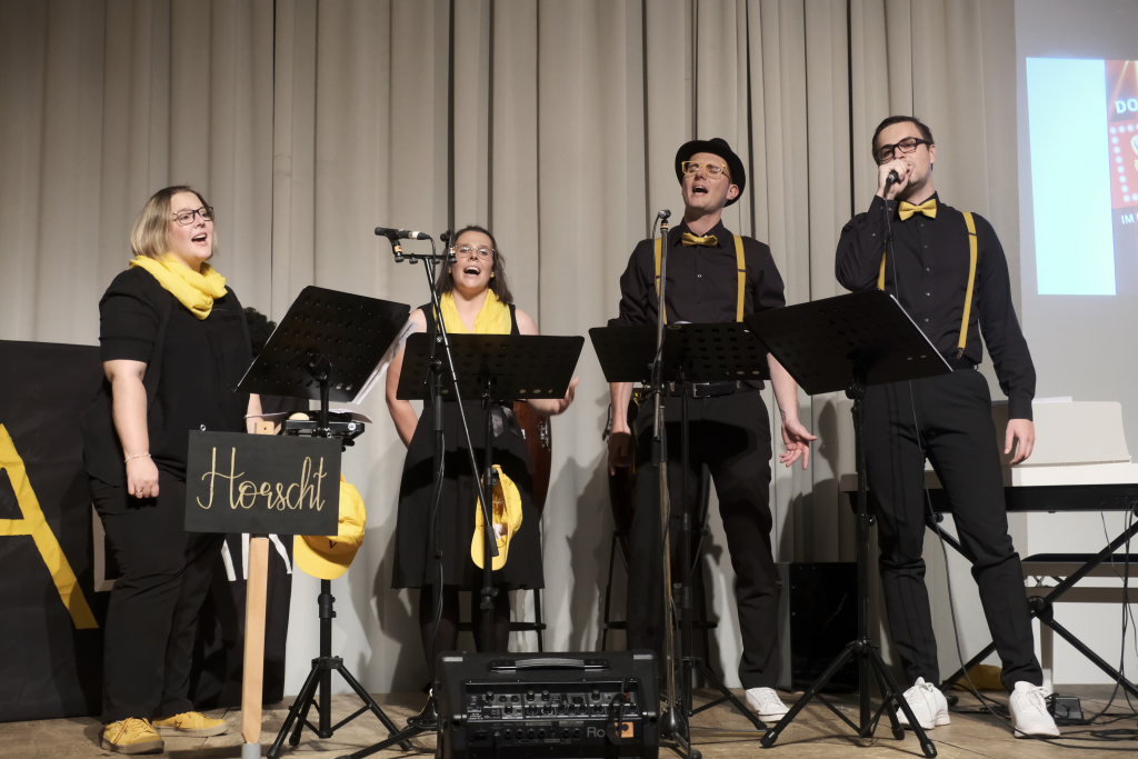 Und so stiegen die Vier mit einem Werbesong-Medley, an dessen Ende sie gleich noch ein Erinnerungs-Selfie anhingen, in ihr Abenteuer ein. Aus dem Hit der Toten-Hosen „Altes Fieber“ wurde bei Vieragsang mit feinsinnigem schwäbischem Humor das Lied der schmerzenden Glieder. Wo ihre musikalischen Wurzeln liegen, zeigten sie bei dem afrikanischen Gospel Mamaliye, begleitet von Klaus Bendel am Cajon. Ihren wunderbaren Humor präsentierten sie dann auch bei ihrer philosophischen Betrachtung darüber, warum englische Titel soviel erfolgreicher sind als deutsche.