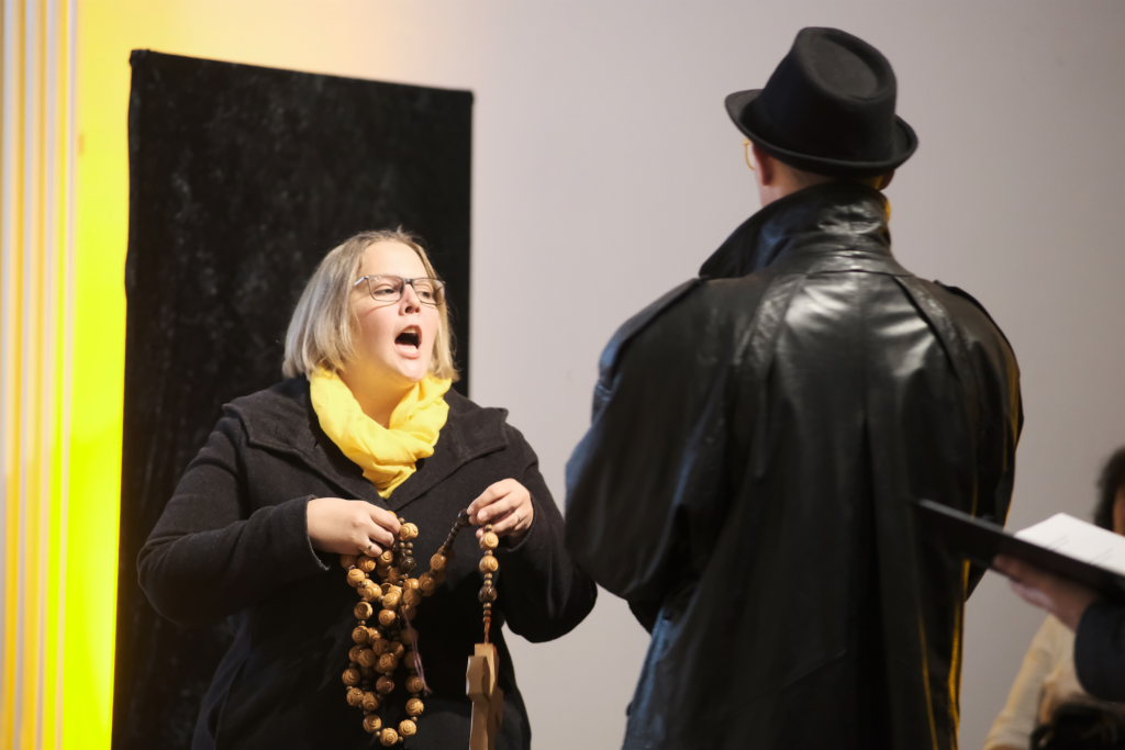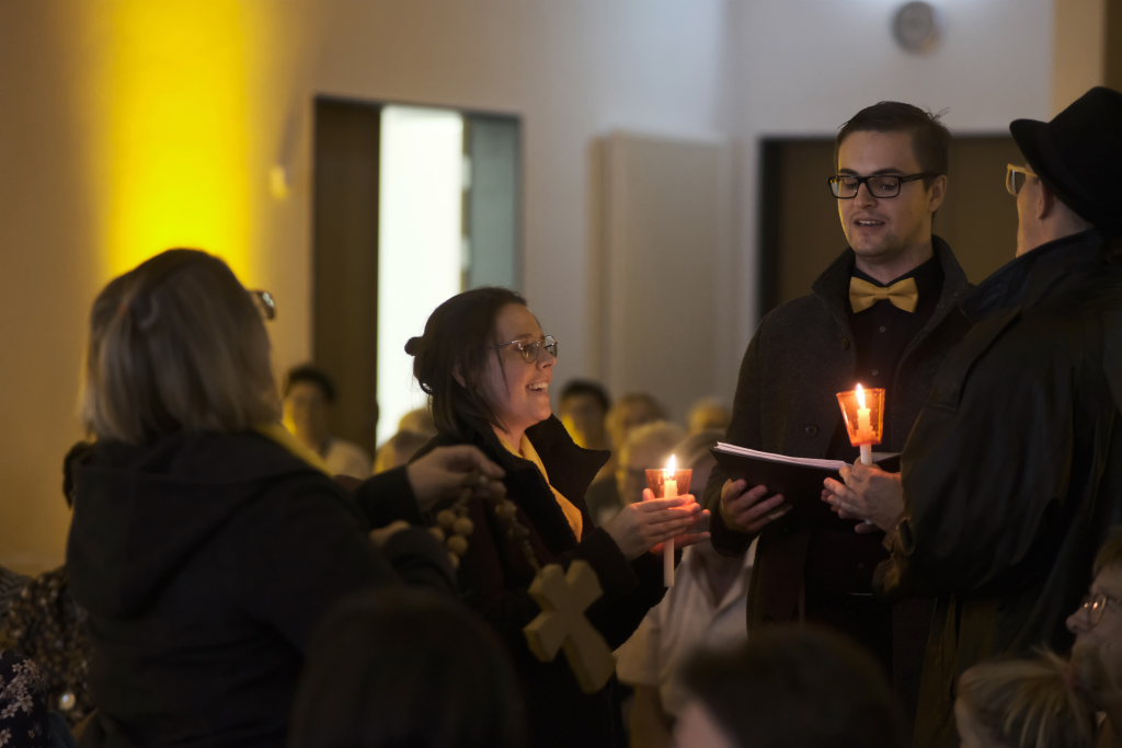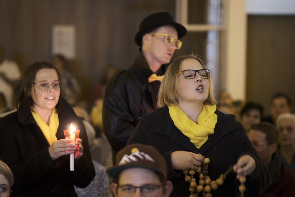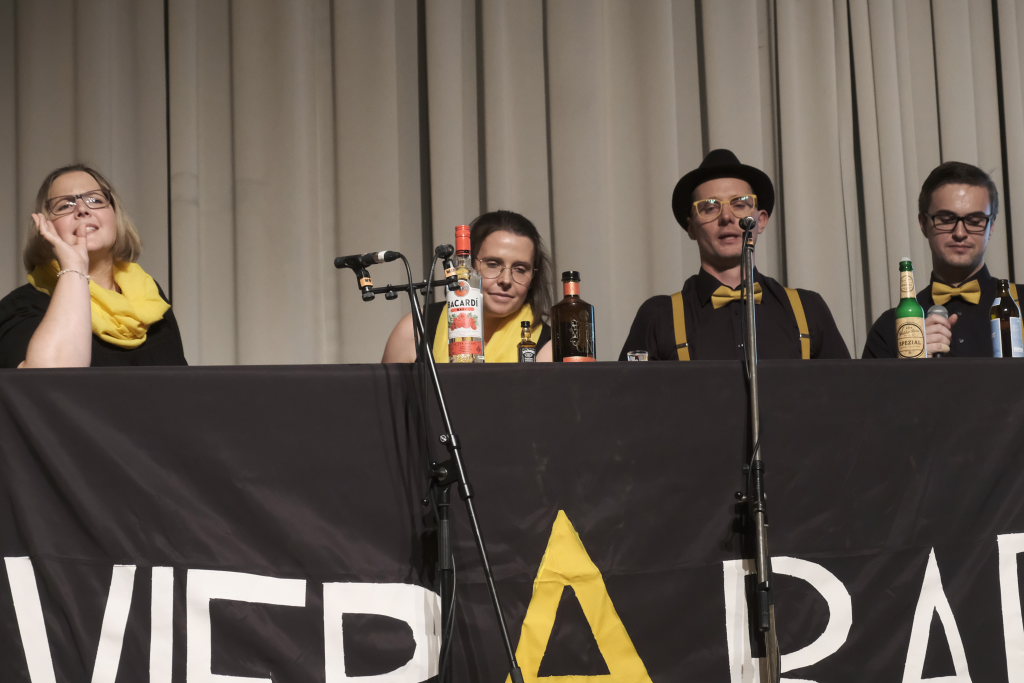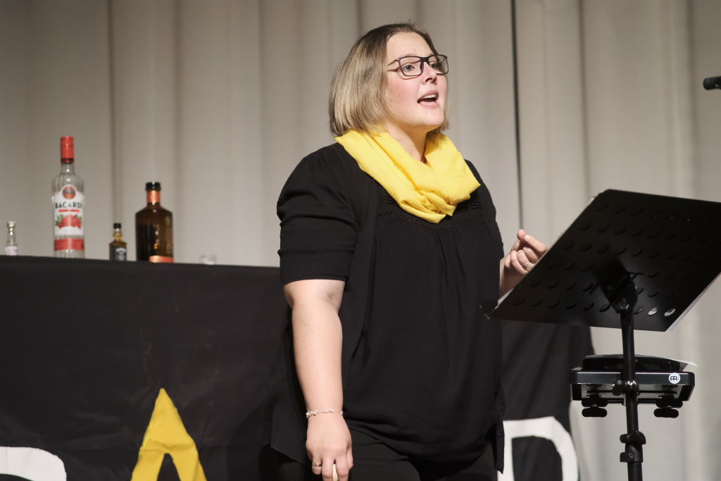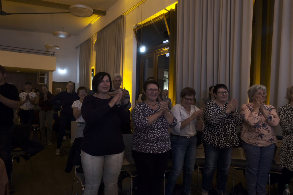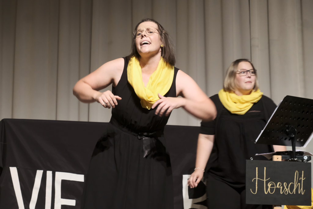 Feierlich kehrten sie dann mit „Laudate“ und Kerzenlicht zurück, wobei sie den Litanei-Text leicht modifizierten. Um dann auf der Bühne rasch den Habit abzulegen und mit „Don´t stop me now“ gleich wieder richtig zur Sache zu kommen. An der Vierabar ließen sie dann Johannes´ Junggesellenabschied noch einmal aufleben. Von dort ging es dann rasch durch die Lebensjahrzehnte mit dem Udo-Jürgens-Klassiker „Mit 66 Jahren“. Ebenfalls schon zum Chorgesang-Klassiker geworden ist das Stück „ Mir im Süden“ der A-Cappella-Gruppe Füenf. Zu einer Ode an Susi Müller wurde das Ramalang-Dingdong, das Anthony als Solist bestritt. Mit dem eher ruhigen „Weit, weit weg“ wollte sich der Vieragsang danach von der Bühne verabschieden, was aber stehende Ovationen des begeisterten Publikums und Lisa Burger und Monika Schmid vom Führungsteam des Frauenbundes zu verhindern wussten. Letztere, weil sie den Sängerinnen und Sängern noch gerne ein Mittel gegen ihren kratzenden Hals zukommen lassen wollten. Und das Publikum weil es noch lange nicht genug gehört hatte.