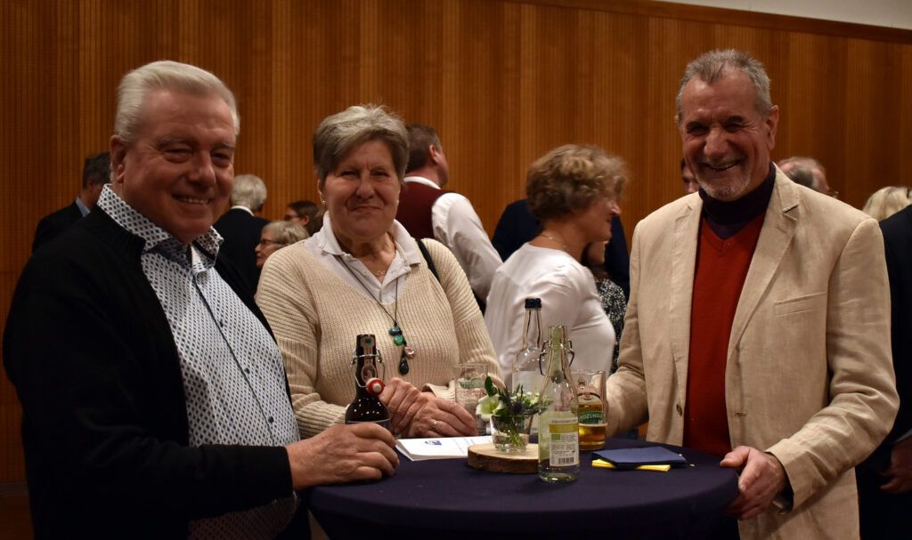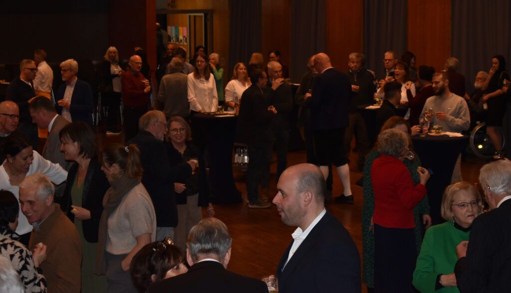 Nach dem Programm wurden schnell die Stühle weggeräumt, die Häppchen serviert, und die anwesenden Gäste fanden sich schnell zu Gruppen und anregenden Gesprächen zusammen. Viele Gratulationen gab es für Ruth Groseker und Anton Mang. Die Stadtkapelle spielte in kleinerer Besetzung und unterhielt mit flotten Weisen.