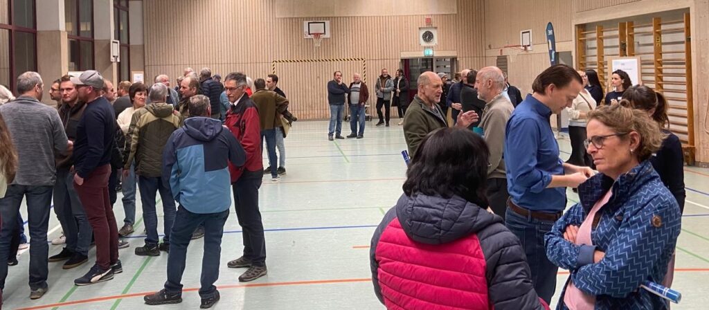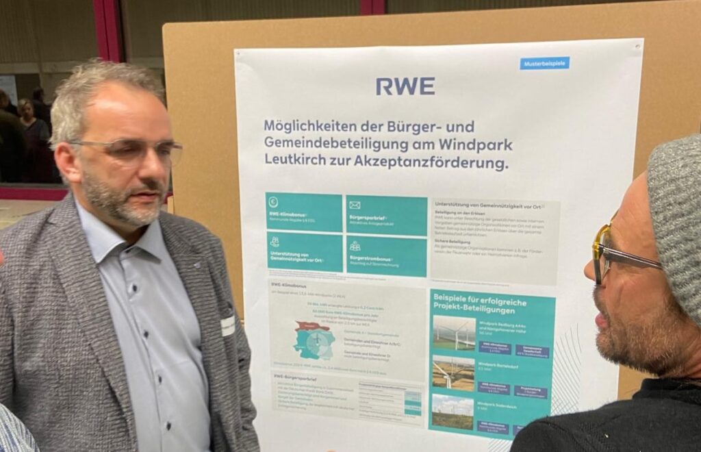 Solche Bedenken hat auch schon Lautrachs Bürgermeister Reinhard Dorn schriftlich geäußert. Wie Henle, so zeigt sich Dorn bei der RWE-Veranstaltung am Mittwochabend in Wuchzenhofen. Aus Lautrach sei „fast der ganze Gemeinderat” nach Wuchzenhofen gekommen, berichtet ein Mitglied dieses Entscheidungsgremiums. Aus dem Stadtrat Leutkirch erkenne er dagegen kaum jemand. Zu sehen sind etwa Berthold König (Grünes Bürgerforum) und CDU-Fraktionschef Waldemar Westermayer. Dieser stößt am Mittwochabend bei einigen im Hallenpublikum immer wieder auf Zustimmung. Hatte Westermayer als Mitglied der Regionalverbandsversammlung Bodensee-Oberschwaben doch gegen den neuen Regionalplan mit seinen Windkraft-Planungen gestimmt.