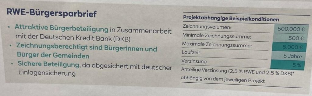 Der RWE-Bürgersparbrief ist keine Gewinnbeteiligung im gesellschaftsrechtlichen Sinne. Es handelt sich hierbei um eine befristete Kapitalanlage mit einer Garantieverzinsung. Die Zeichnungsvolumen ist im hier gezeigten Beispielfall auf 500.000 € beschränkt (1 WEA kostet 3 bis 6 Millionen €). Ausgeschüttet werden bei einer 100-Prozent-Nachfrage nach den Bürgersparbriefen in fünf Jahren in Summe 125.000 €. Der Umsatzerlös aus 2 WEA über 20 Jahre bewegt sich im zweistelligen Millionenbereich. (rei)