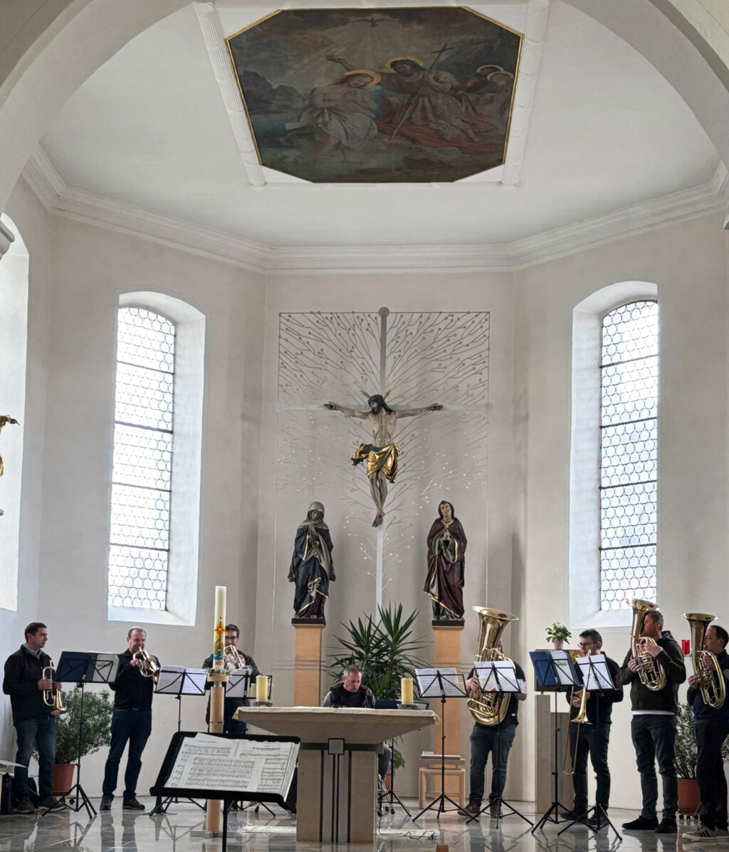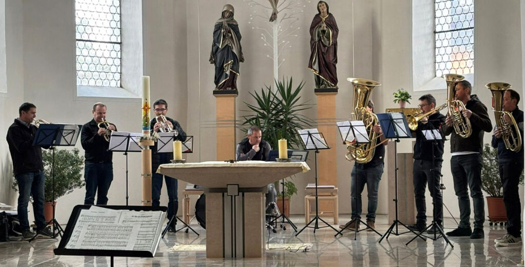 Feinste Blechblasmusik gab es abwechselnd dazu vom langjährigen und erfahrenen Ensemble „Feinblech“ aus der Region Gebrazhofen-Engerazhofen, ein wahrer Ohrenschmaus bei der tollen Akustik der Pfarrkirche, es gab Gänsehaut pur. Eigentlich waren die Abendklänge bei der La-Salette-Kapelle vorgesehen gewesen, doch die unsichere Witterung ließ es nicht zu. So wurde kurzerhand über Beamer die Kapelle in die Kirche geholt. Eine Pilgergruppe aus Bad Waldsee traf rechtzeitig ein, angeleitet von Benjamin Sigg, der sich bei allen Besuchern der „Abendklänge“ herzlich bedankte und zu weiteren Terminen einlud.