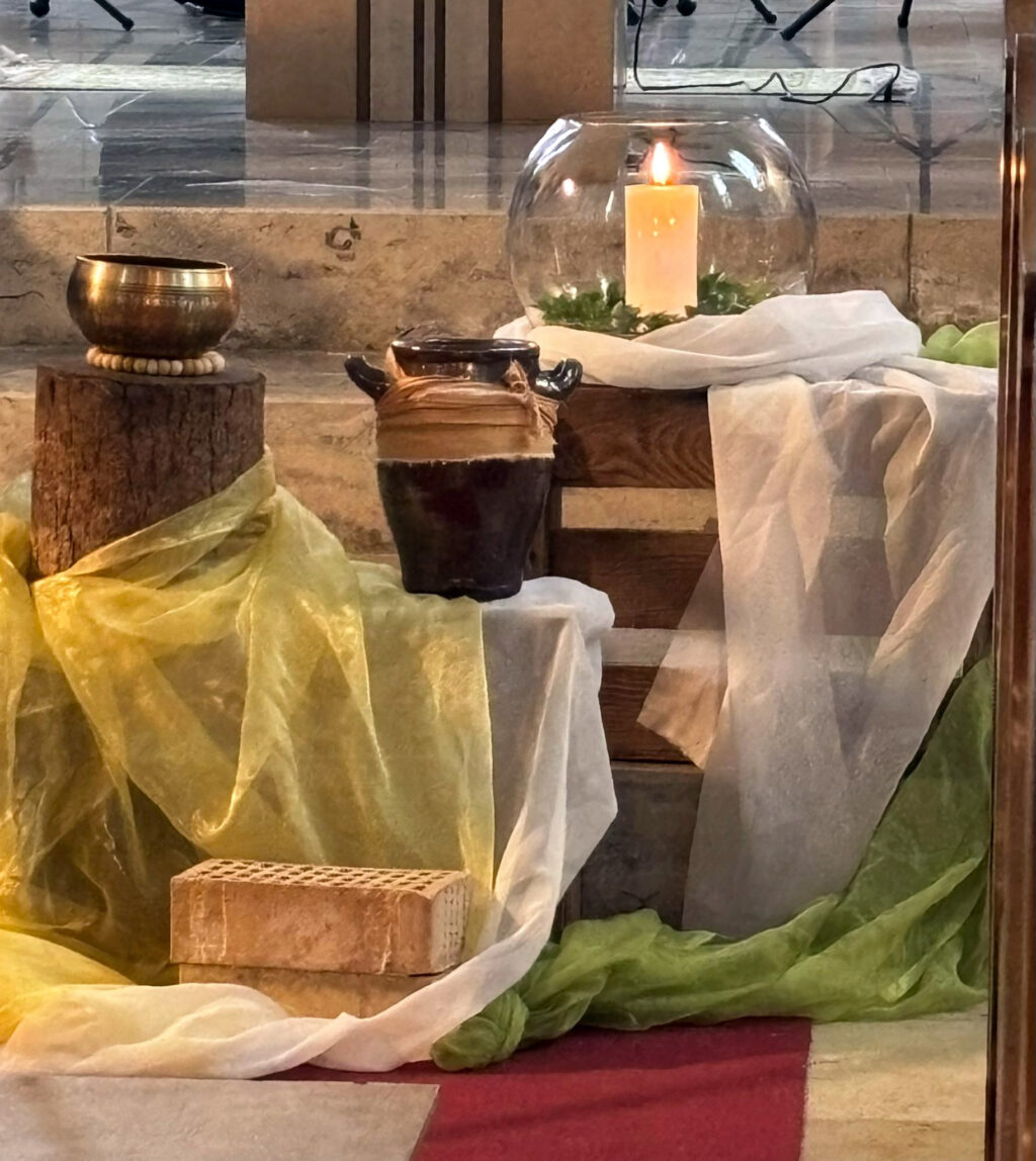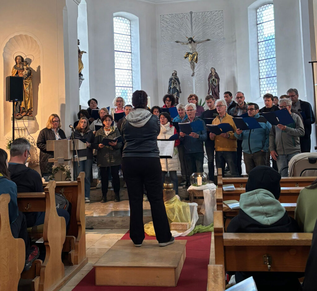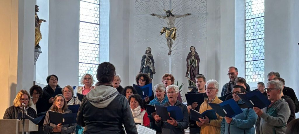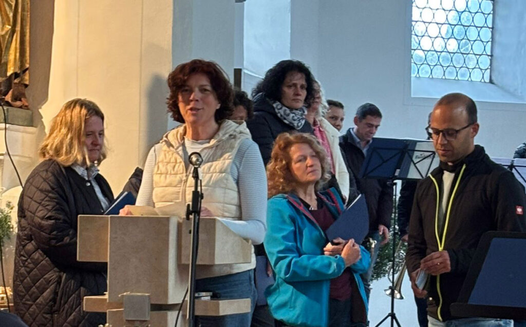 In Engerazhofen führte Petra Vogel durchs ansprechende Programm, mit spirituellen Texten und kleinen Geschichten, die zum Nachdenken anregten. Zurücklehnen konnte man sich bei wunderschönen Melodien der Sängergruppe, mal besinnlich, mal rhythmisch, mal zum Mitsummen oder Träumen. Karin Stohr leitete die Sänger/innen aus Engrazhofen an, Ingrid Menig begleitete am Piano, Fred Sipple am Cajon.