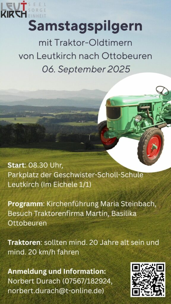 Leutkirch – Mit den Traktoren aus vergangenen Zeiten sind wir gemeinsam pilgernd unterwegs auf den Spuren unserer Vorfahren. Dankbar für alle Erntegaben wollen wir gemeinsam ein Stück Weg fahren. Los geht es am 6. September um 8.30 Uhr auf dem Parkplatz der Geschwister-Scholl-Schule Leutkirch (Im Eichele 1/1). Ziel ist Ottobeuren.