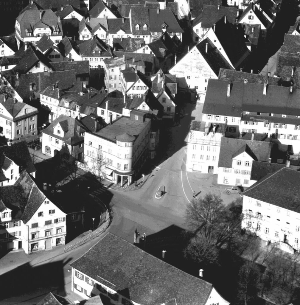 Die “Mohren”-Brücke im Jahre 1956 – damals funkelnagelneu. Gehalten hat sie nur 70 Jahre. Luftbild (größerer Ausschnitt): Bertram/Stadtarchiv Leutkirch.