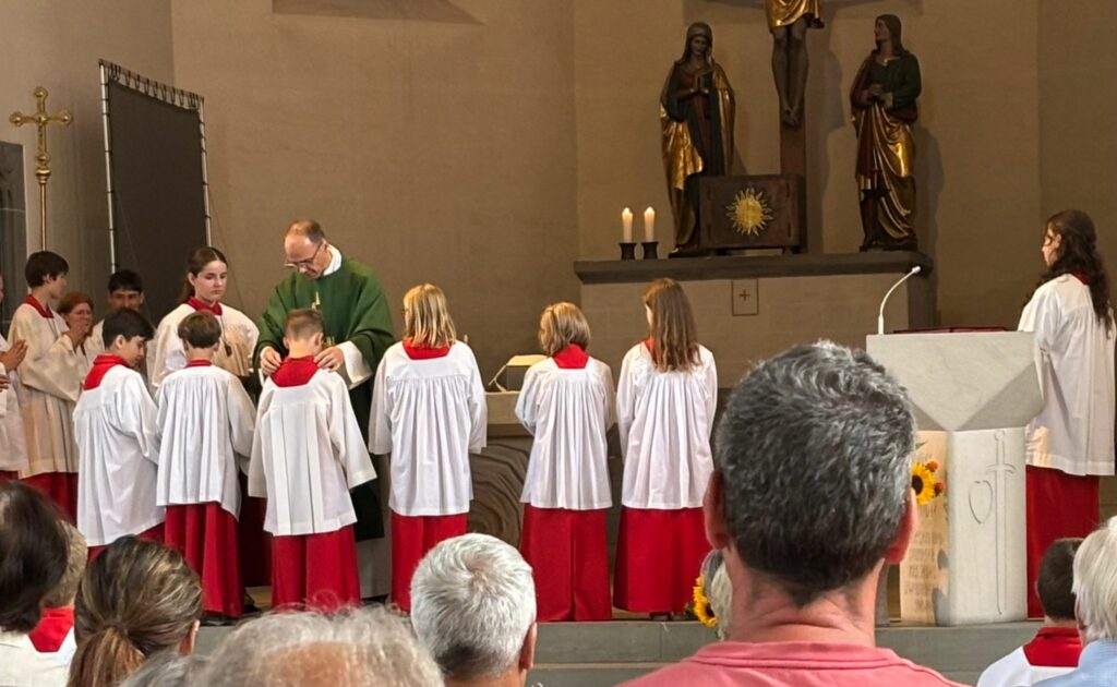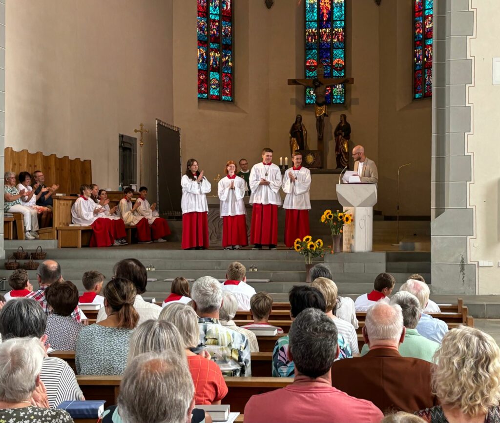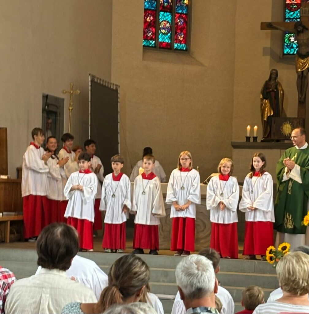 Innerhalb dieser etwas anderen summertime-Messe werden auch jedes Jahr die „altgedienten Minis“ namentlich verabschiedet. Denis Hemer von der Pfarrgemeinde, zuständig für „die Jugend und das Chillix / Treff“, fand liebe und lobende Worte. Besonders geehrt für seinen langen Dienst, auch als Mini-Sprecher, wurde Konstantin Künst. Die neuen Ministranten wurden ebenfalls namentlich vorgestellt, Pfarrer Braun überreichte jeder/m das Kreuz, das sie von nun an „im Dienst am Altar“ tragen werden. Die vielen Besucher, darunter viele Eltern/Familien sparten nicht mit langem Beifall, was die jungen Menschen sehr gerne aufnahmen.