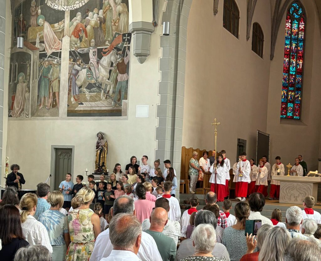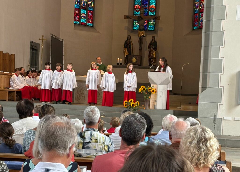 Leutkirch – Immer vor den Sommerferien gibt es einen besonderen Gottesdienst in der Pfarrei St. Martin, zur Einstimmung auf die Leichtigkeit und Lockerheit der Sommerpause, wie z.B. für den Kinder- und Jugendchor inkl. der Instrumentalgruppe, aber auch für Organist Franz Günthner, für die Seelsorger und natürlich für die Kirchenbesucher. An diesem Gottesdienst werden auch neue Ministranten vorgestellt, andere ältere werden von der Gemeinde verabschiedet. Ein neuer Lebensabschnitt beginnt, und damit Abschied vom Mini-Dienst in der Heimatgemeinde. Es gab sehr viel Beifall, besonders auch für den Leutkircher Darius Pfeffer, der als Solist mit ungemein professioneller Stimme auftrat.