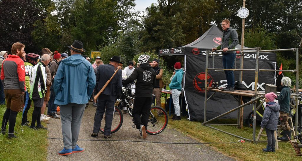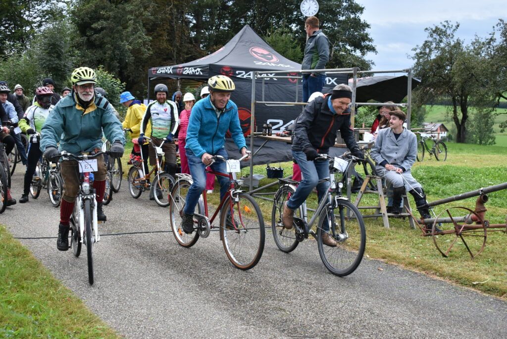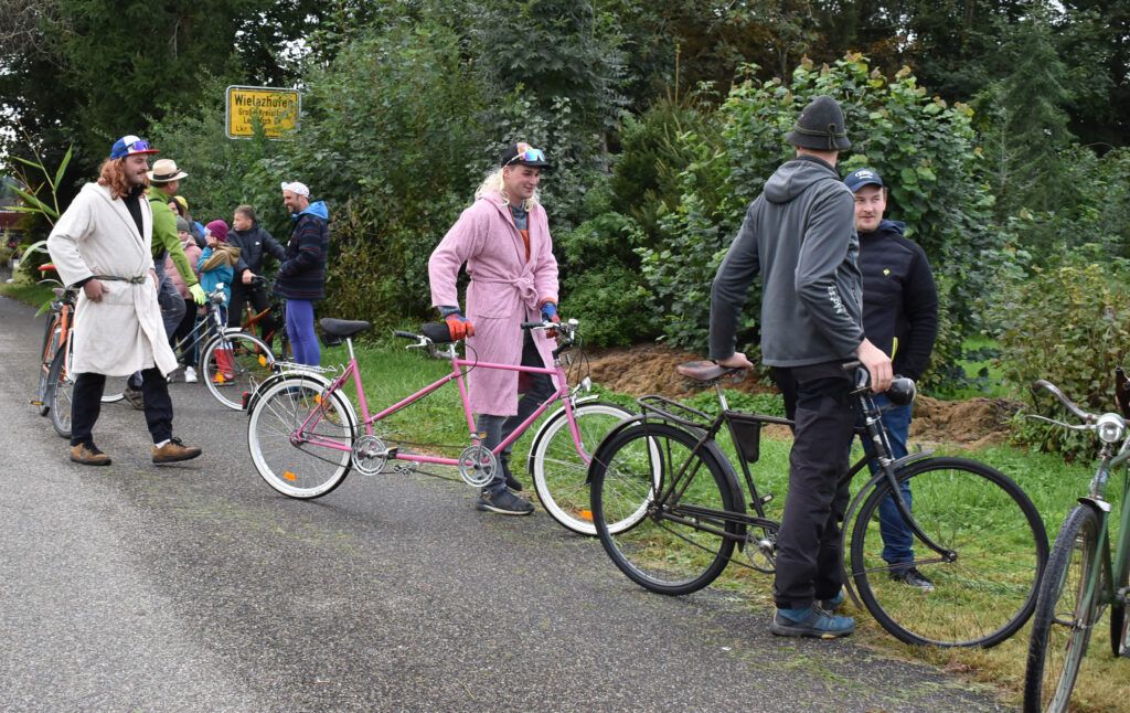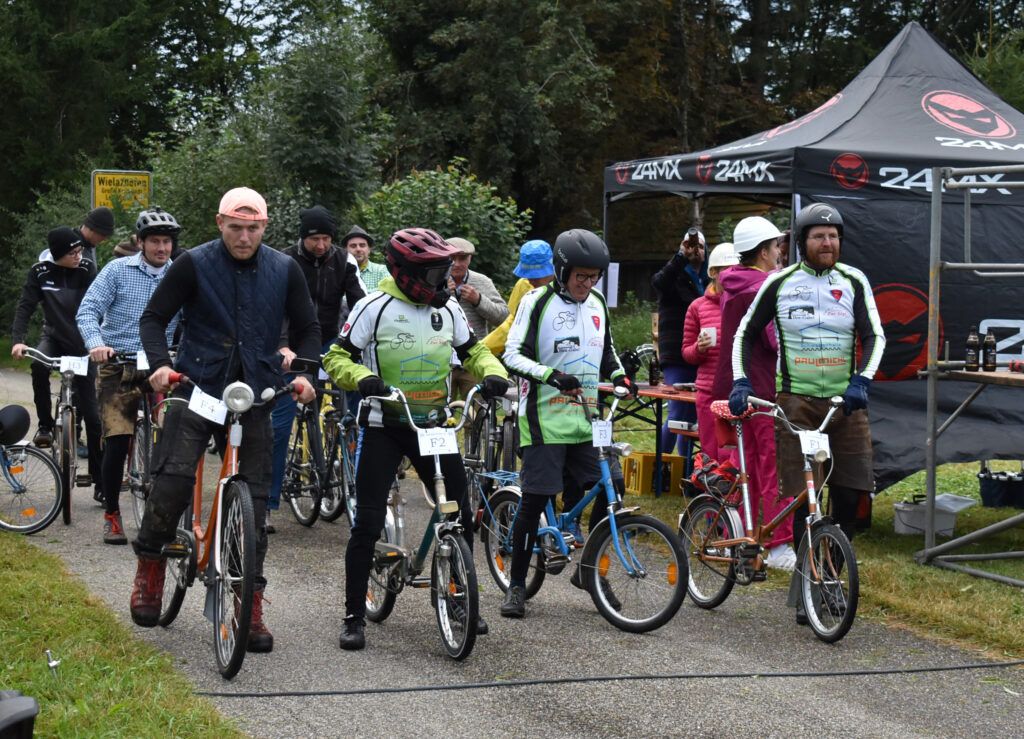 Der Schützenverein Baltrazhofen-Wielazhofen hat zum zweiten Mal zu diesem Historischen Radrennen eingeladen. Waren es 2023 nur rund 30 Teilnehmer, hatte sich die Anzahl fast verdoppelt und mit viel Freude und Spaß gingen alle auf die Strecke. Kinder, Jugendliche, Frauen, Männer und Senioren. Ganz unkonventionell war die Startlinie am Ortsausgang von Wielazhofen einfach ein Seil, doch für den Startschuss wurde extra ein Bschittrohr gezündet.